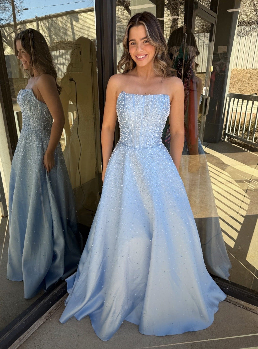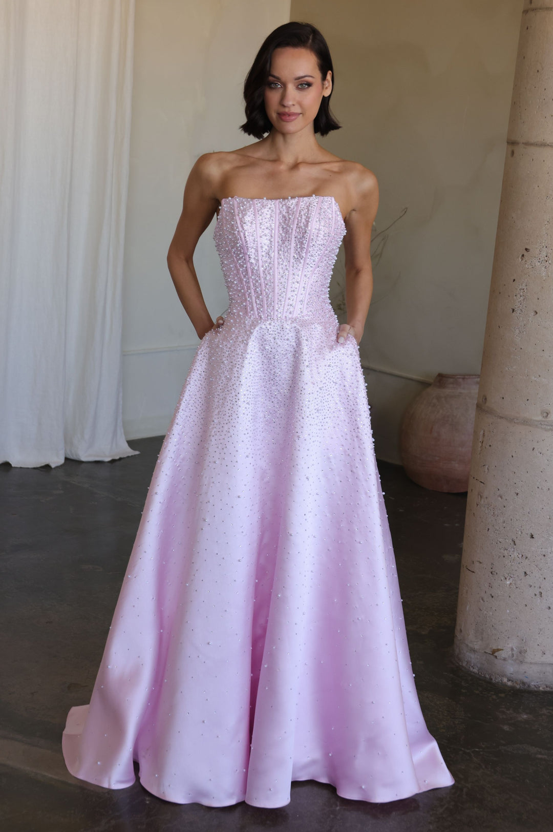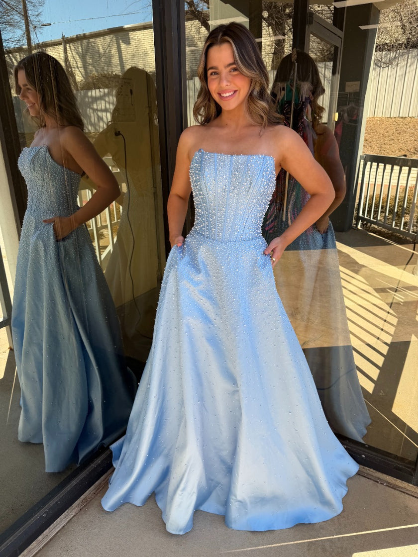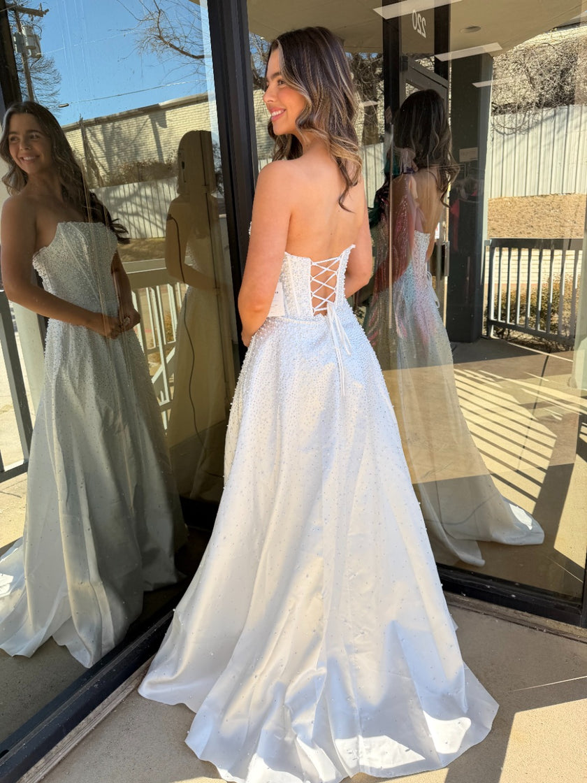 Designed to embody timeless elegance with a modern touch, Ava Presley 47283 features a beautifully structured strapless bodice that enhances the waist with delicate contouring. This strapless corset Mikado gown with pearls and beading showcases refined detailing that adds soft shimmer and dimension throughout the design. The full A-line skirt creates graceful movement with every step, while the lace-up corset back provides adjustable support and a romantic finish. Perfect for formal occasions, or any unforgettable celebration.