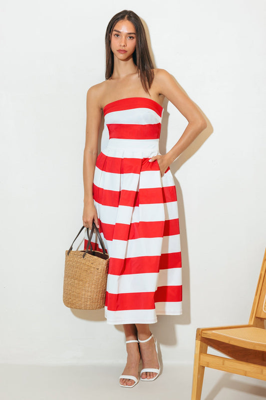Strapless burgundy dress with a belt