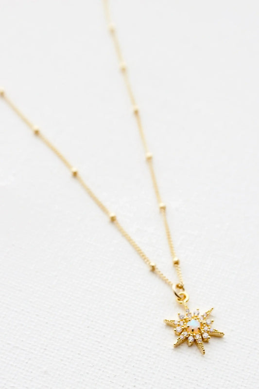 A gold necklace featuring a starfish pendant with a small blue stone hangs on a woman's neck, partially visible above her collarbone, set against a neutral background.