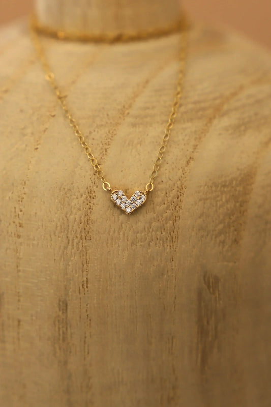 A gold heart pendant hangs from a black cord around a woman's neck. Her skin is smooth and illuminated, with a neutral background highlighting the necklace's shine and form.