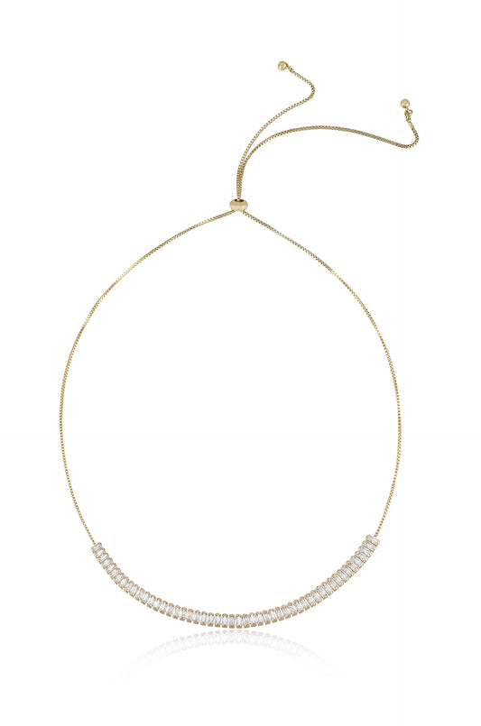 A gold necklace features multiple chains adorned with rectangular and square-shaped crystal accents, elegantly draping with a shiny finish on a plain white background.