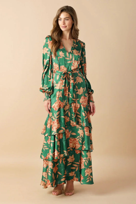 A woman stands gracefully in a fitted, floral-patterned dress with layered ruffles. She poses against a backdrop of greenery and pink flowers, showcasing a relaxed outdoor environment.