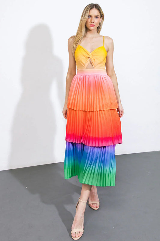 A woman stands confidently wearing a strapless, ombre, form-fitting dress that transitions from light peach to burnt orange, paired with clear heeled sandals against a neutral background.