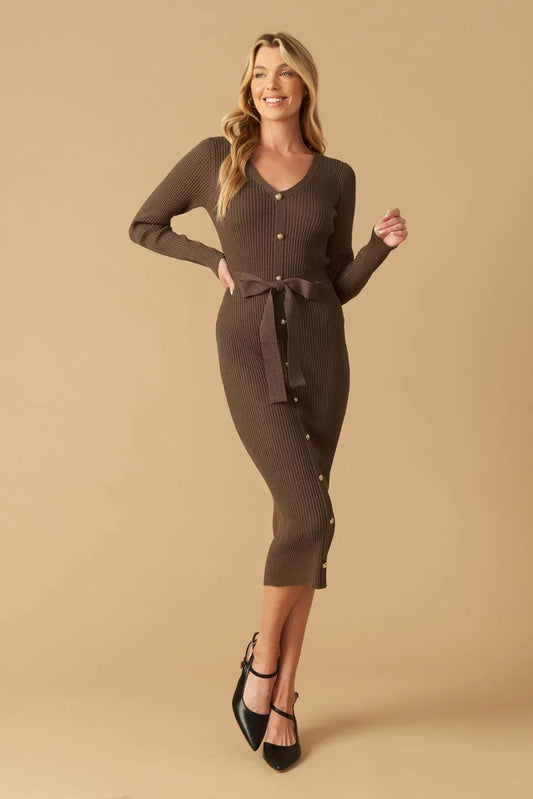 ELEGANT BLOOM BUTTON FRONT BROWN MIDI DRESS