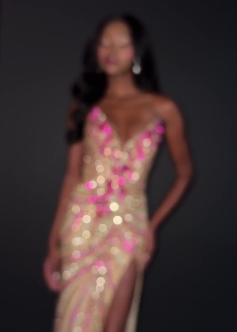Step into the spotlight and make an unforgettable entrance with the 11236 Ashley Lauren Strapless Fuchsia/Gold Floral Sequin Gown. The sweetheart neckline features a stunning floral sequin motif that cascades gracefully down the structured bustier, catching the light from every angle and creating a radiant, luminous effect. The fitted silhouette hugs your curves beautifully, while the left leg slit adds a hint of flirtatious movement. Every inch of this gown exudes sophistication, from the fully hand-beaded embellishments to the floor-length skirt, making it the perfect choice for prom, galas, weddings, or any black-tie event where you want to leave a lasting impression.
