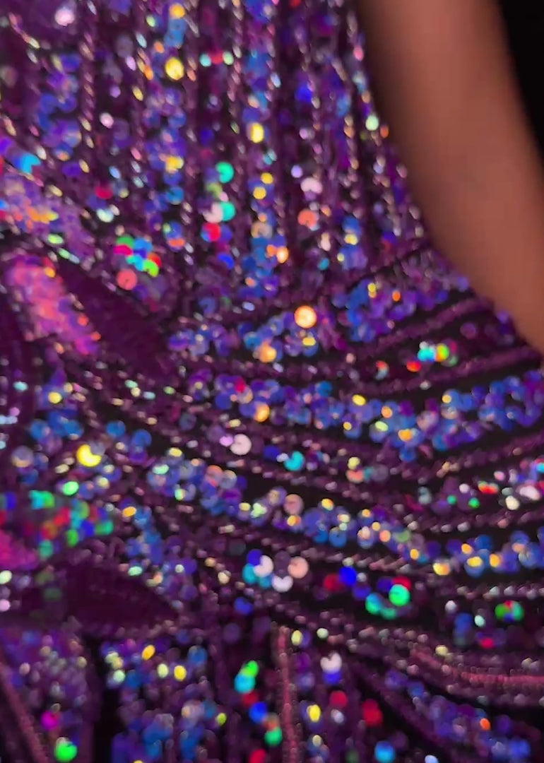 Step into the spotlight and make an unforgettable entrance with the 11236 Ashley Lauren Strapless Orchid/Black Floral Sequin Gown. The sweetheart neckline features a stunning floral sequin motif that cascades gracefully down the structured bustier, catching the light from every angle and creating a radiant, luminous effect. The fitted silhouette hugs your curves beautifully, while the left leg slit adds a hint of flirtatious movement. Every inch of this gown exudes sophistication, from the fully hand-beaded embellishments to the floor-length skirt, making it the perfect choice for prom, galas, weddings, or any black-tie event where you want to leave a lasting impression.