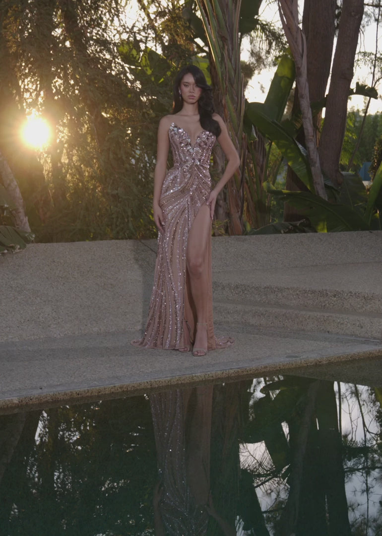 Step into the spotlight and make an unforgettable entrance with the 11236 Ashley Lauren Strapless Taupe Floral Sequin Gown. The sweetheart neckline features a stunning floral sequin motif that cascades gracefully down the structured bustier, catching the light from every angle and creating a radiant, luminous effect. The fitted silhouette hugs your curves beautifully, while the left leg slit adds a hint of flirtatious movement. Every inch of this gown exudes sophistication, from the fully hand-beaded embellishments to the floor-length skirt, making it the perfect choice for prom, galas, weddings, or any black-tie event where you want to leave a lasting impression.