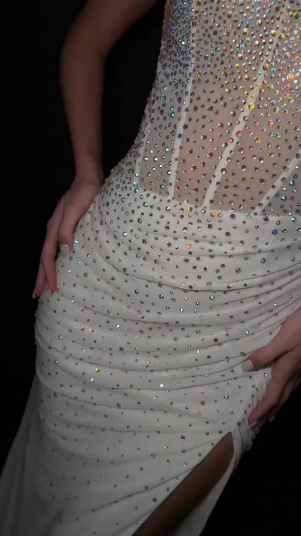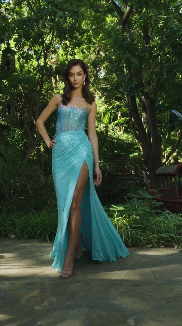 Make an unforgettable entrance in the Ashley Lauren 11616, a glamorous fitted gown designed to captivate from every angle. This stunning silhouette features a sparkling beaded corset bustier that adds dimension and shine, paired with sleek spaghetti straps for a delicate, modern touch. The sheer bodice with stone accents enhances the gown’s sculpted fit, while the left leg slit adds movement and a sensual edge.