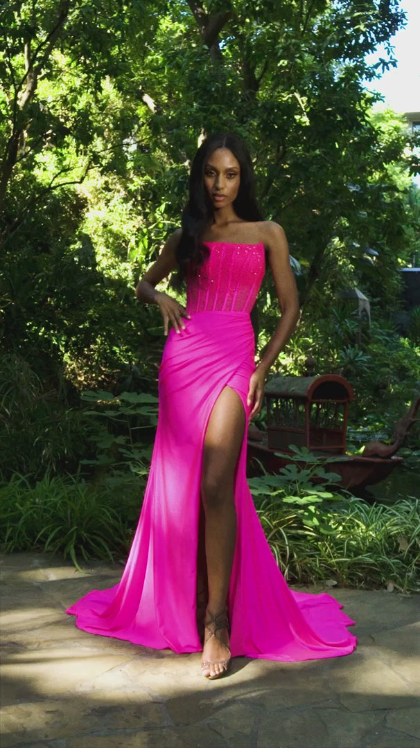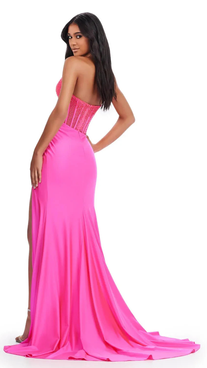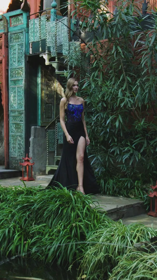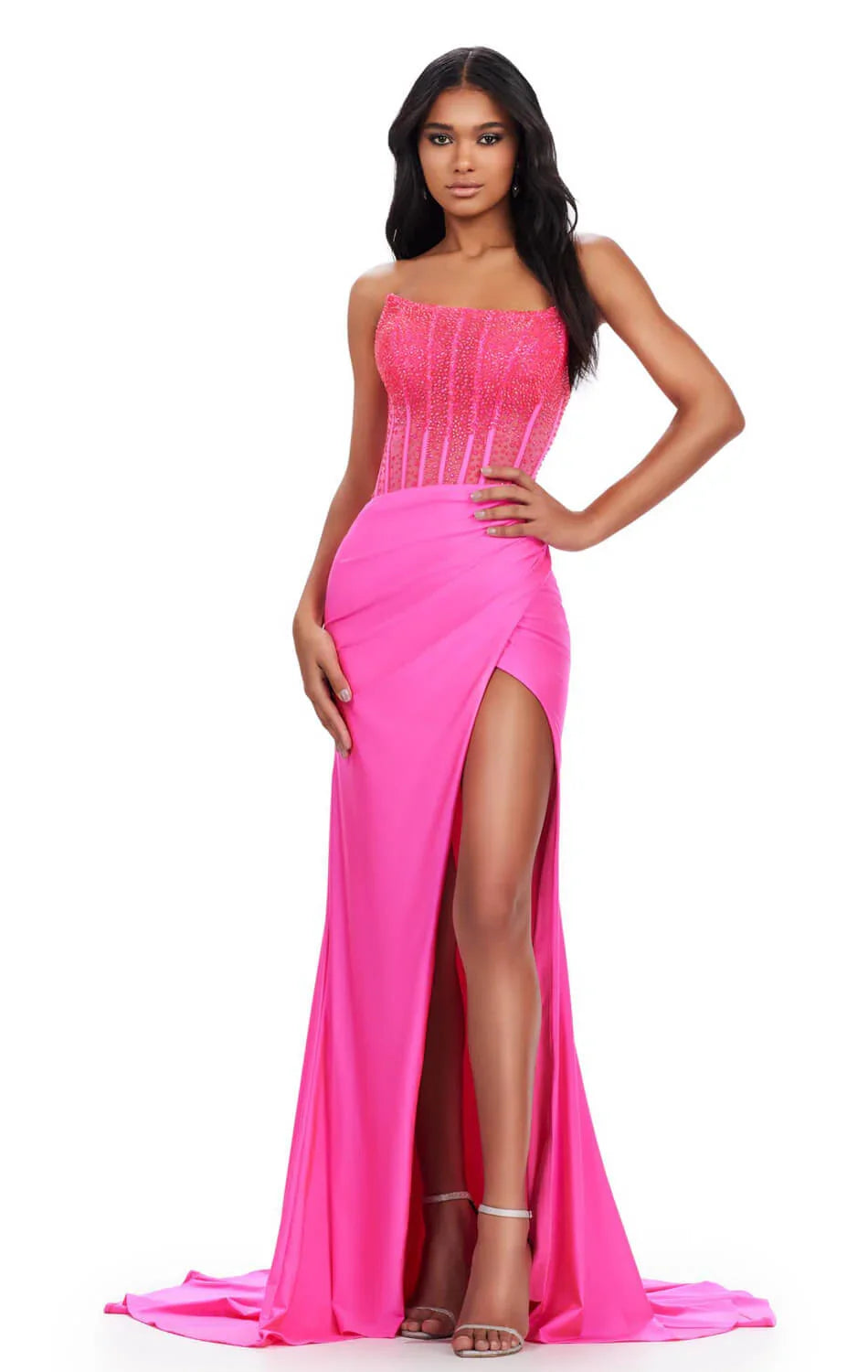 Step into glamour with the Ashley Lauren 11690 gown, a strapless evening dress designed to turn heads. Featuring a corset bustier with exposed boning encrusted in sparkling press-on stones, this gown combines structure with shimmer. The ruched skirt and left leg slit create a flattering, elegant silhouette perfect for prom, galas, or black-tie events.