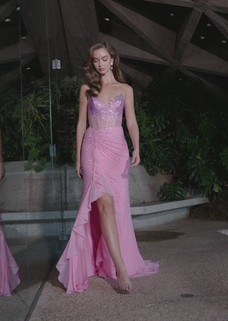 Shine from every angle in this stunning Ashley Lauren 11854 gown. The sweetheart neckline features a fully beaded corset bustier that adds sparkle and elegance, while press-on stones cascade gracefully down the skirt. A right-leg slit paired with delicate ruffle detailing creates movement and a touch of drama, making this gown perfect for prom, galas, or any formal event where you want to stand out.