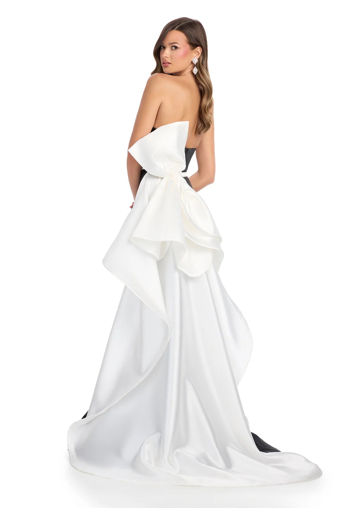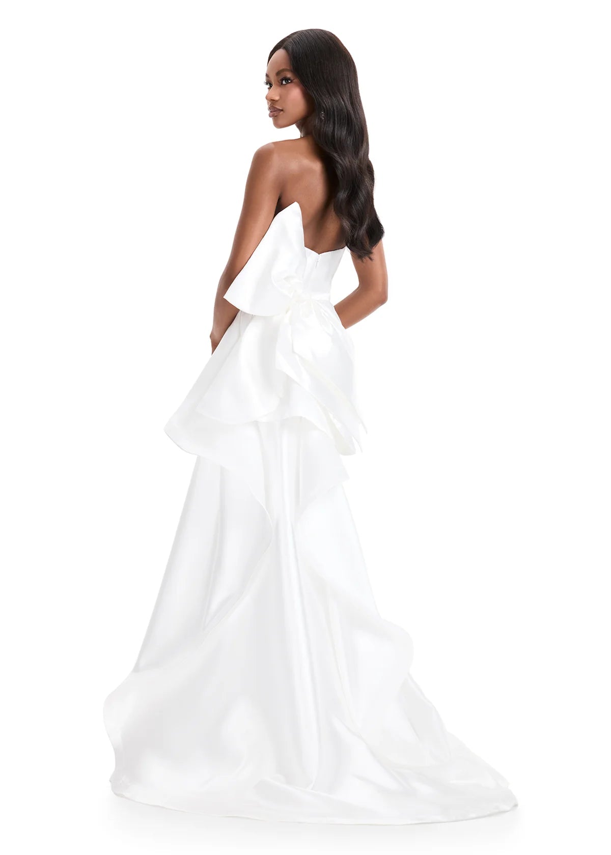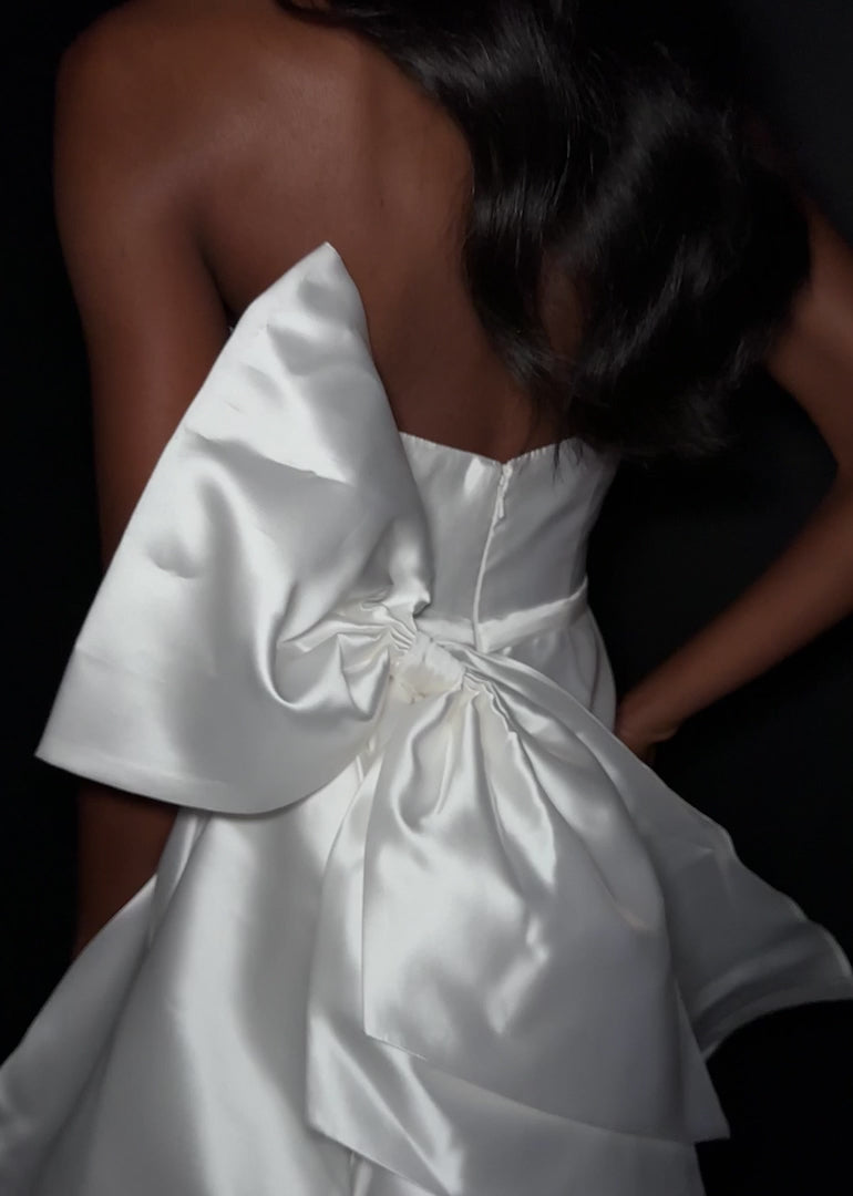 We love a bow—and this strapless mikado gown delivers timeless elegance with a dramatic finish. Designed with a clean strapless neckline, this sophisticated silhouette features a flattering belt at the waist and a daring left leg slit for a modern touch. The look is elevated by a statement bow at the back that cascades gracefully down into a sweep train, creating beautiful movement from every angle.