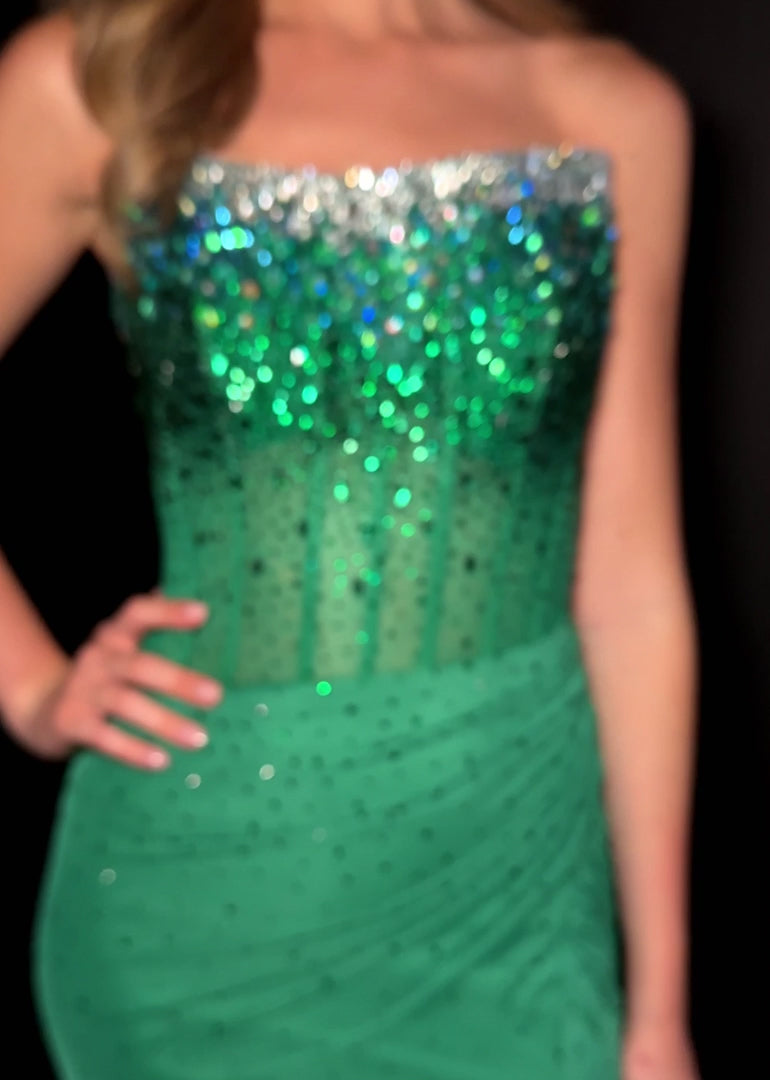 Make a statement in the Ashley Lauren 11904 gown, a stunning strapless dress designed to turn heads at any formal event. Featuring a beaded corset bustier that flows into a press-on stone embellished skirt, this gown combines glamour with elegance. The left leg slit and sweep train add dramatic movement for a show-stopping finish. Ideal for prom, galas, weddings, and black-tie events.