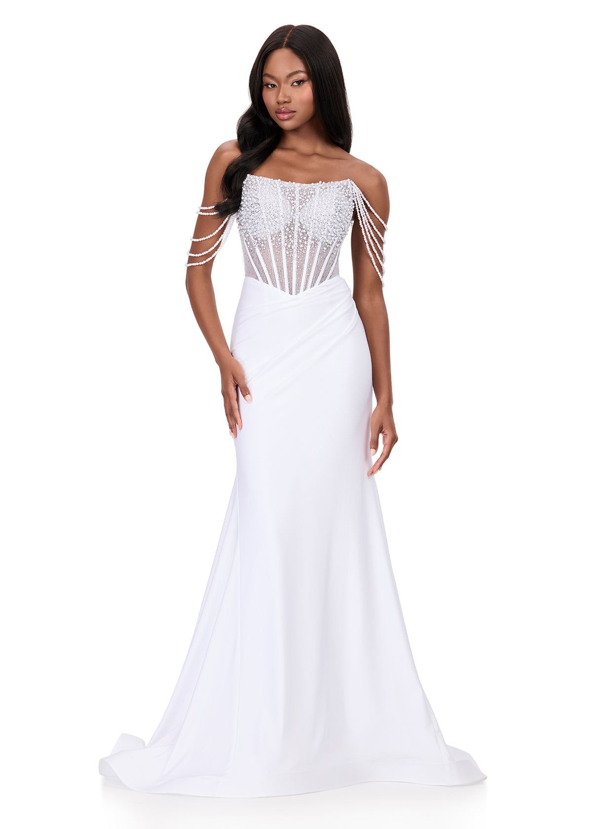Make an unforgettable entrance in the ASHLEYlauren 12154 gown, an elegant off-shoulder jersey design crafted to captivate. The fitted silhouette features a fully embellished bodice with dazzling press-on stones that catch the light beautifully. Draped pearl shoulder straps add sophistication, while the ruched waist and sweeping train create a figure-flattering finish. Ideal for prom, pageants, formal evenings, or bridal events.