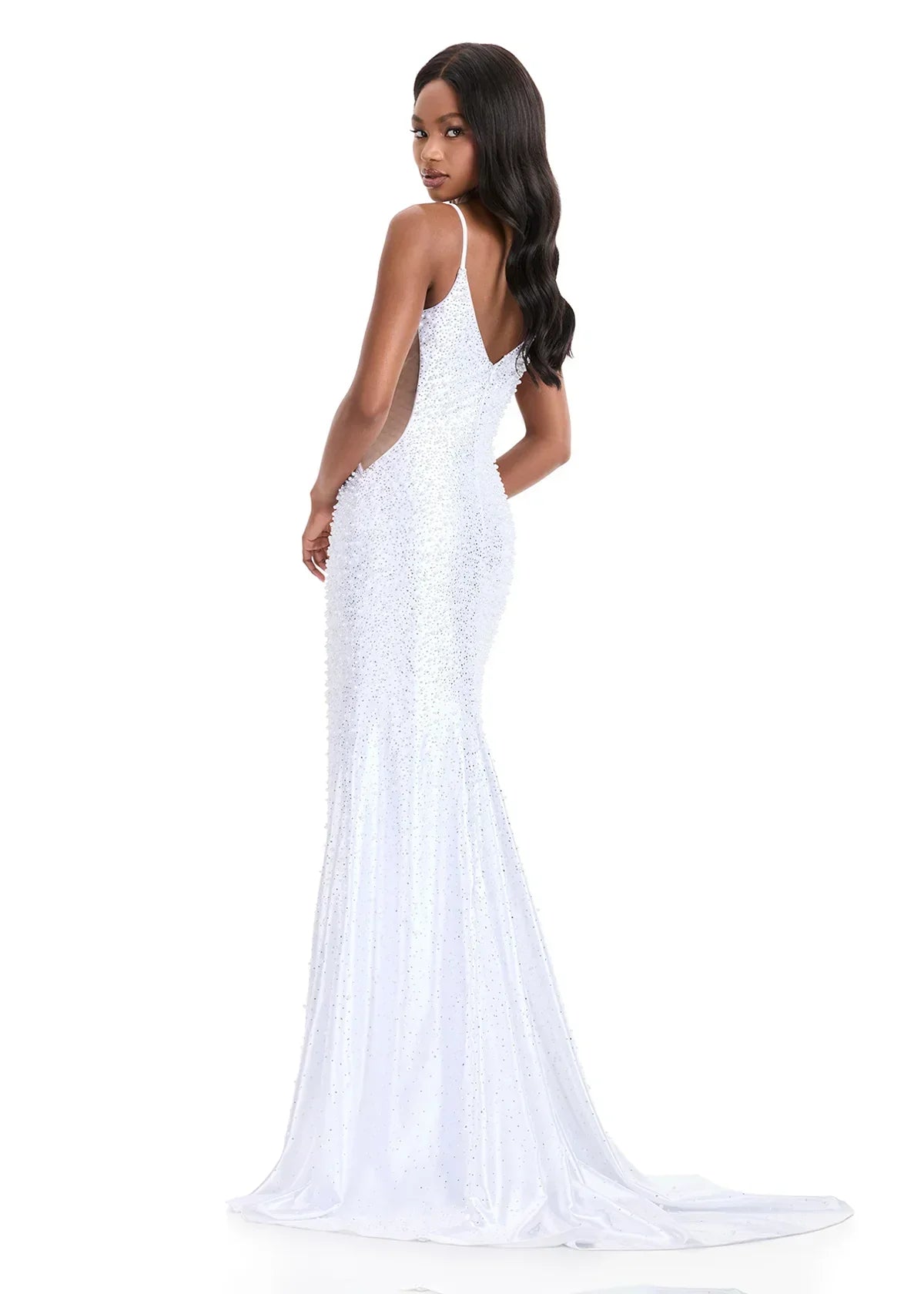Turn heads in the dazzling ASHLEYlauren Style 12155, a sleek jersey gown designed for high-impact glamour. Featuring a flattering plunging V-neckline with double spaghetti straps, this fitted silhouette is elevated by bold side cutouts that lead into an open back for a striking, modern finish. Heat-set stones and pearl embellishments shimmer throughout, while a thigh-high slit adds confidence and movement. This gown is a stunning choice for prom, pageants, black-tie events, and bridal celebrations where sparkle is essential.