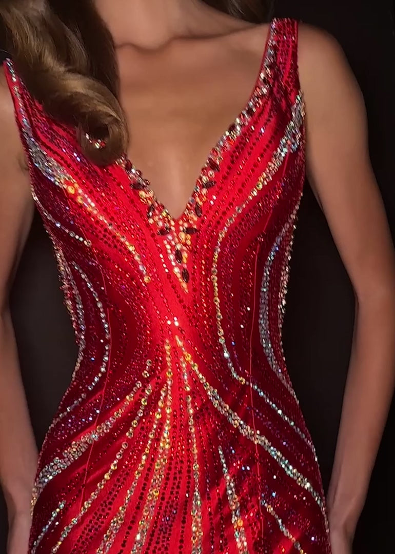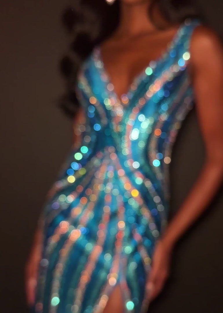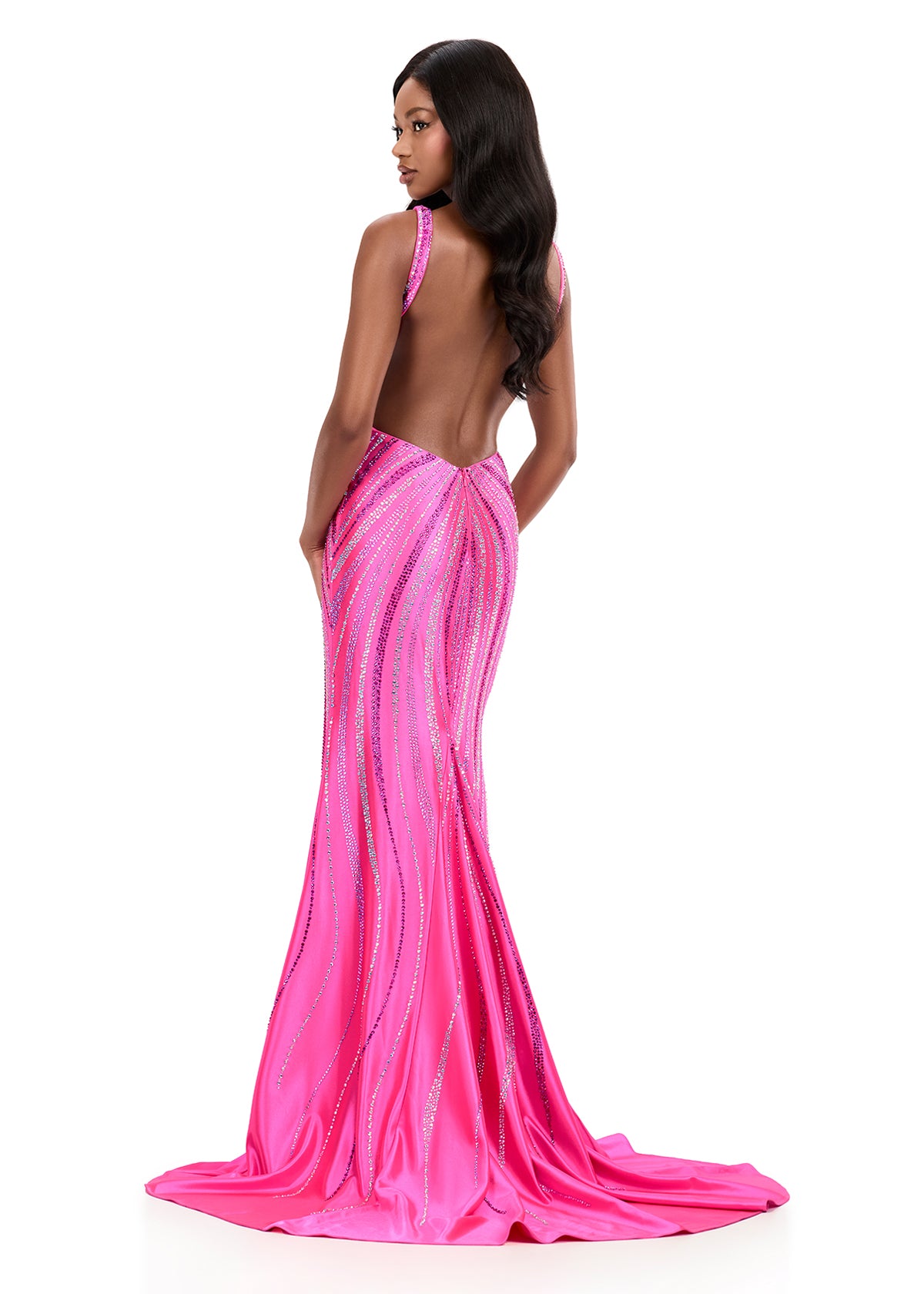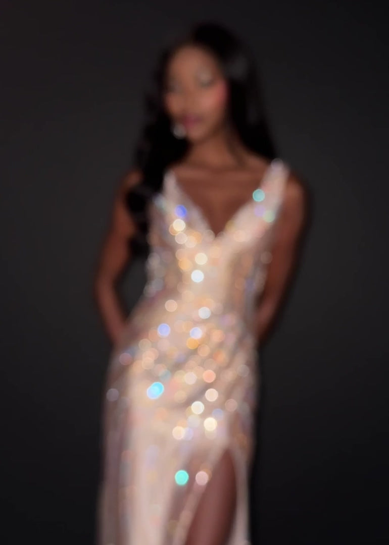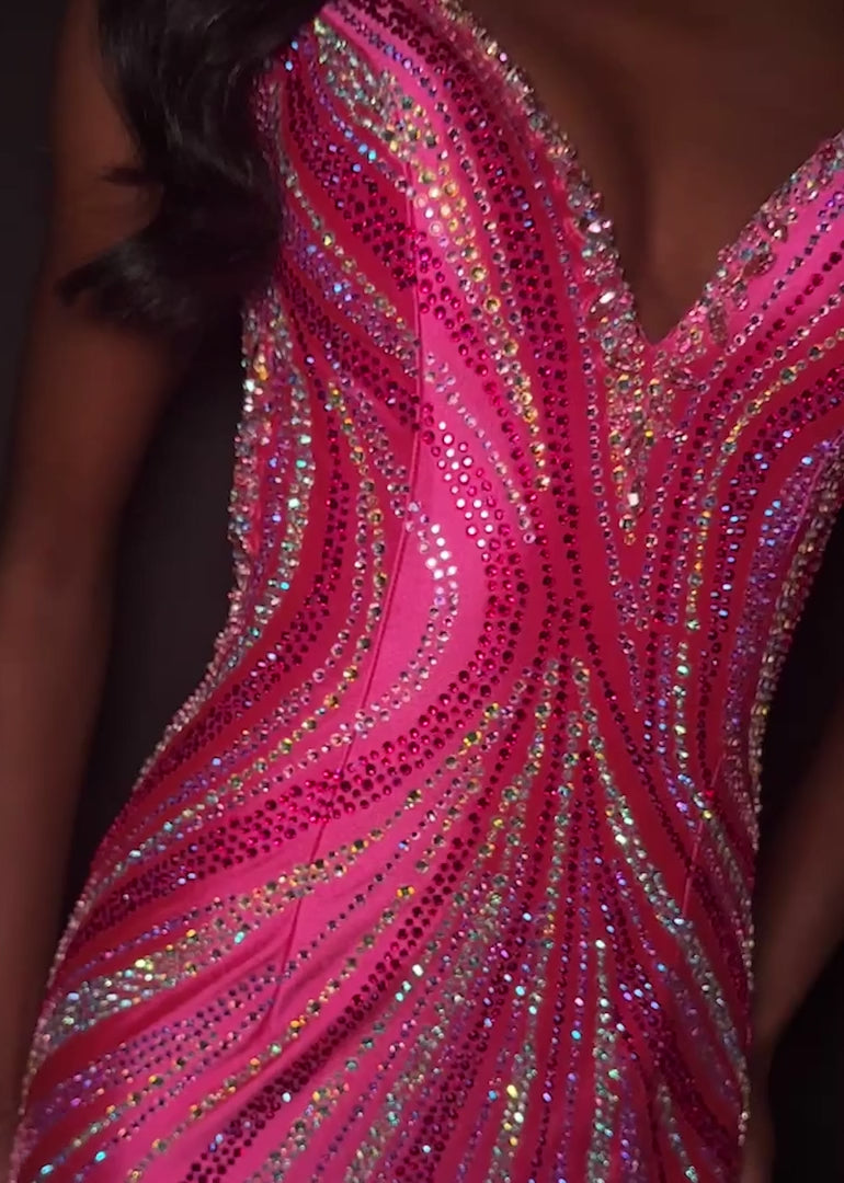 Turn heads in ASHLEYlauren Style 12253, a fully beaded evening gown designed to captivate. This striking silhouette features a flattering V-neckline and a sleek, fitted shape that contours the body beautifully. Intricate heat-set stones form a swirling pattern that enhances your natural curves while delivering radiant sparkle from every angle. A dramatic high slit and low open back complete the look, adding bold sophistication perfect for prom, pageants, or formal events.