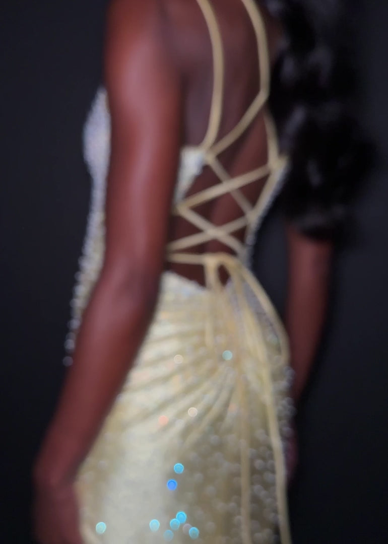 Make an entrance in ASHLEYlauren Style 12357. This gown features full pearl beading, a fitted silhouette, lace up back and sleek sweetheart neckline. The vertical beadwork accentuates the waist and elongates the figure.