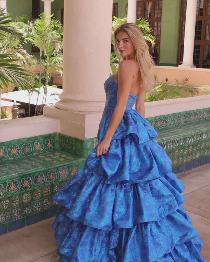 Turn heads in the Ava Presley 26412, a breathtaking ball gown featuring a dazzling floral jacquard fabric. The strapless bodice offers a structured fit with a sweetheart neckline, perfectly flowing into a dramatic full skirt. The back reveals tiered cascading ruffles that add volume and flair, making it a perfect choice for a grand entrance at any formal event.