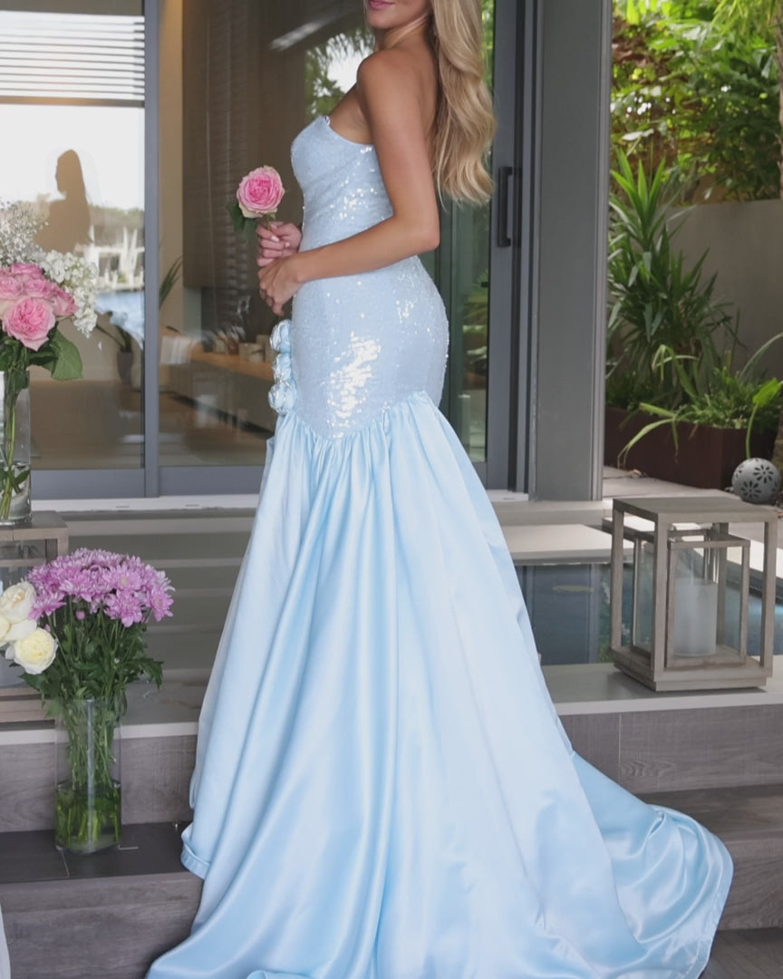 Make a mesmerizing entrance in the Ava Presley 26520 gown. This shimmering mermaid dress features a dazzling sequin bodice and a soft satin flare that flows into a graceful train. The sweetheart neckline and side slit add a touch of elegance and allure, while floral accents at the hip give it a feminine twist. Perfect for prom, pageants, or red carpet moments.