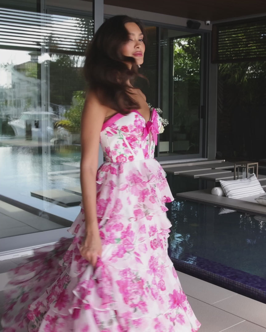 Make a show-stopping entrance in this romantic Ava Presley 42207 gown. Featuring a structured corset bodice with a sweetheart neckline and playful front bow, this floral dress flows into a cascade of ruffled layers that exude elegance and movement. A high front slit adds a daring touch to the feminine charm, making it perfect for prom, pageants, or formal occasions.