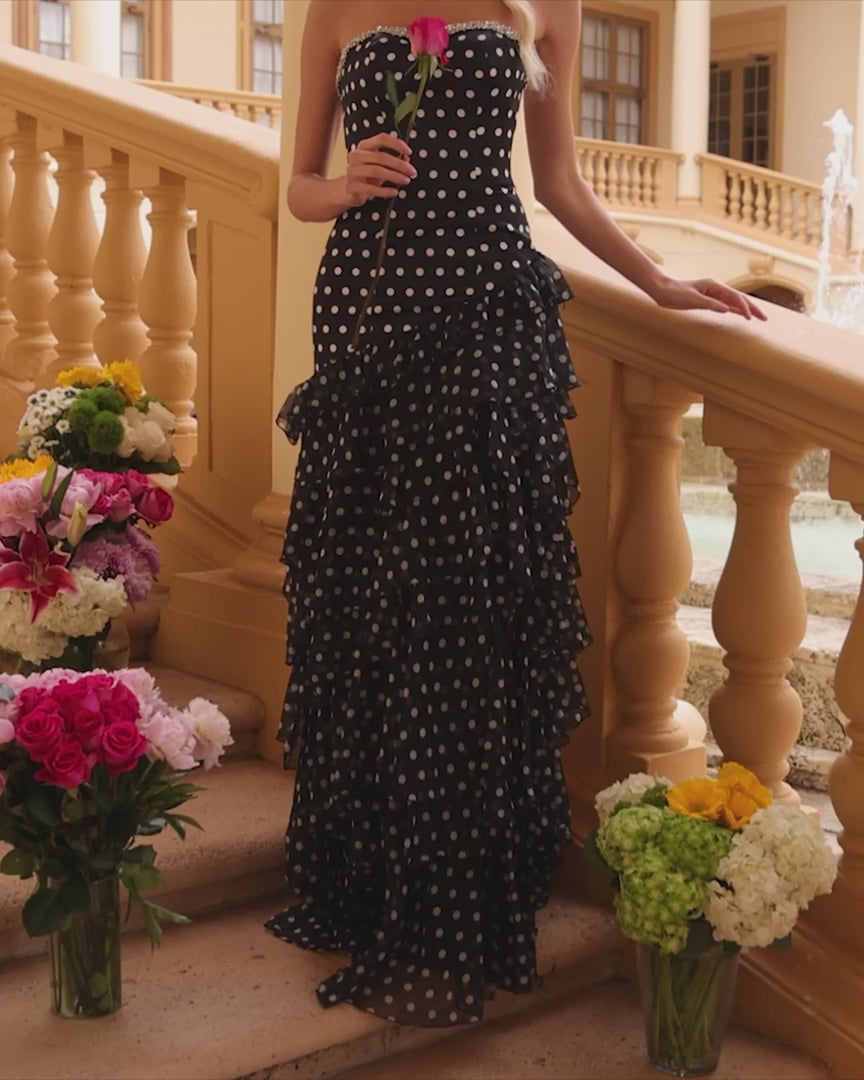 Step into the spotlight in Ava Presley 42434, a ruffled polka dot prom dress that effortlessly blends vintage charm with modern flair. The strapless design and cascading tiered skirt create graceful movement, while the form-fitting bodice accentuates your figure. Featuring a side slit for added allure, this gown is perfect for girls searching for a polkadot prom dress with a fashion-forward edge.