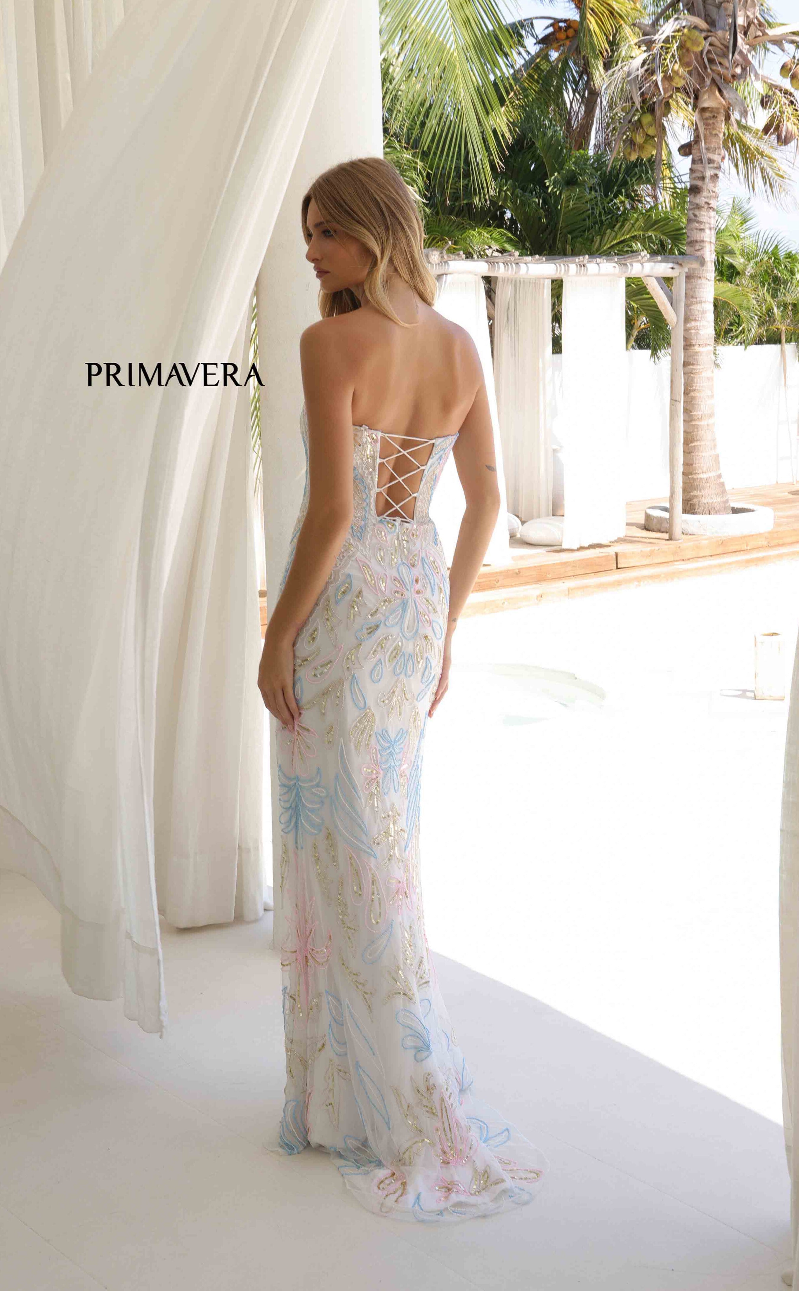 Stand out in the breathtaking Primavera 4331, the epitome of luxury and sophistication. This figure-hugging dress boasts a classic strapless scoop neckline and a corset lace-up back, accentuating your curves. With a bold leg-baring slit and a cascading train, this gown exudes drama. Adorned with exquisite beadwork in intricate designs, this dress will captivate all who lay eyes on you.