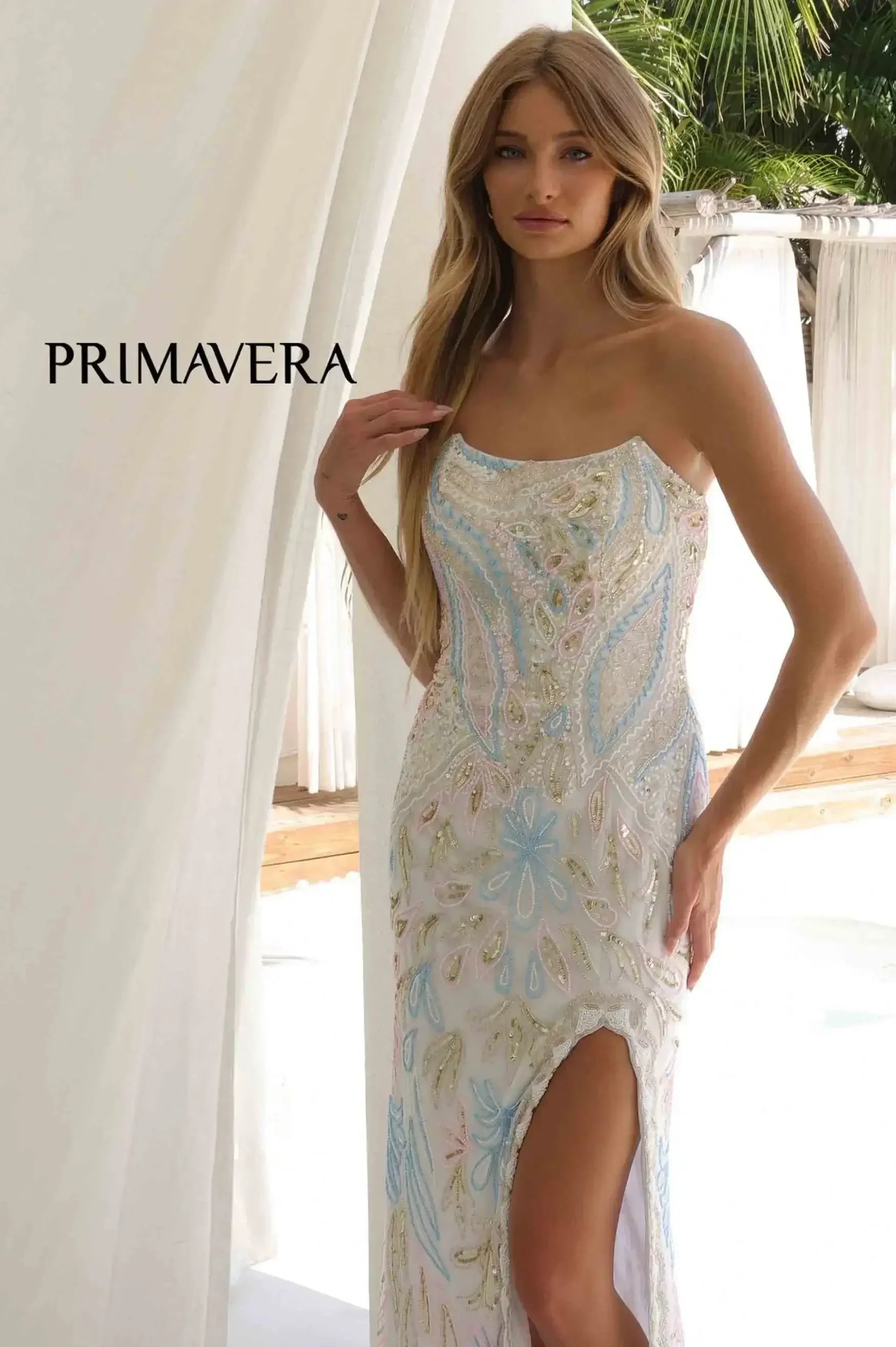 Stand out in the breathtaking Primavera 4331, the epitome of luxury and sophistication. This figure-hugging dress boasts a classic strapless scoop neckline and a corset lace-up back, accentuating your curves. With a bold leg-baring slit and a cascading train, this gown exudes drama. Adorned with exquisite beadwork in intricate designs, this dress will captivate all who lay eyes on you.