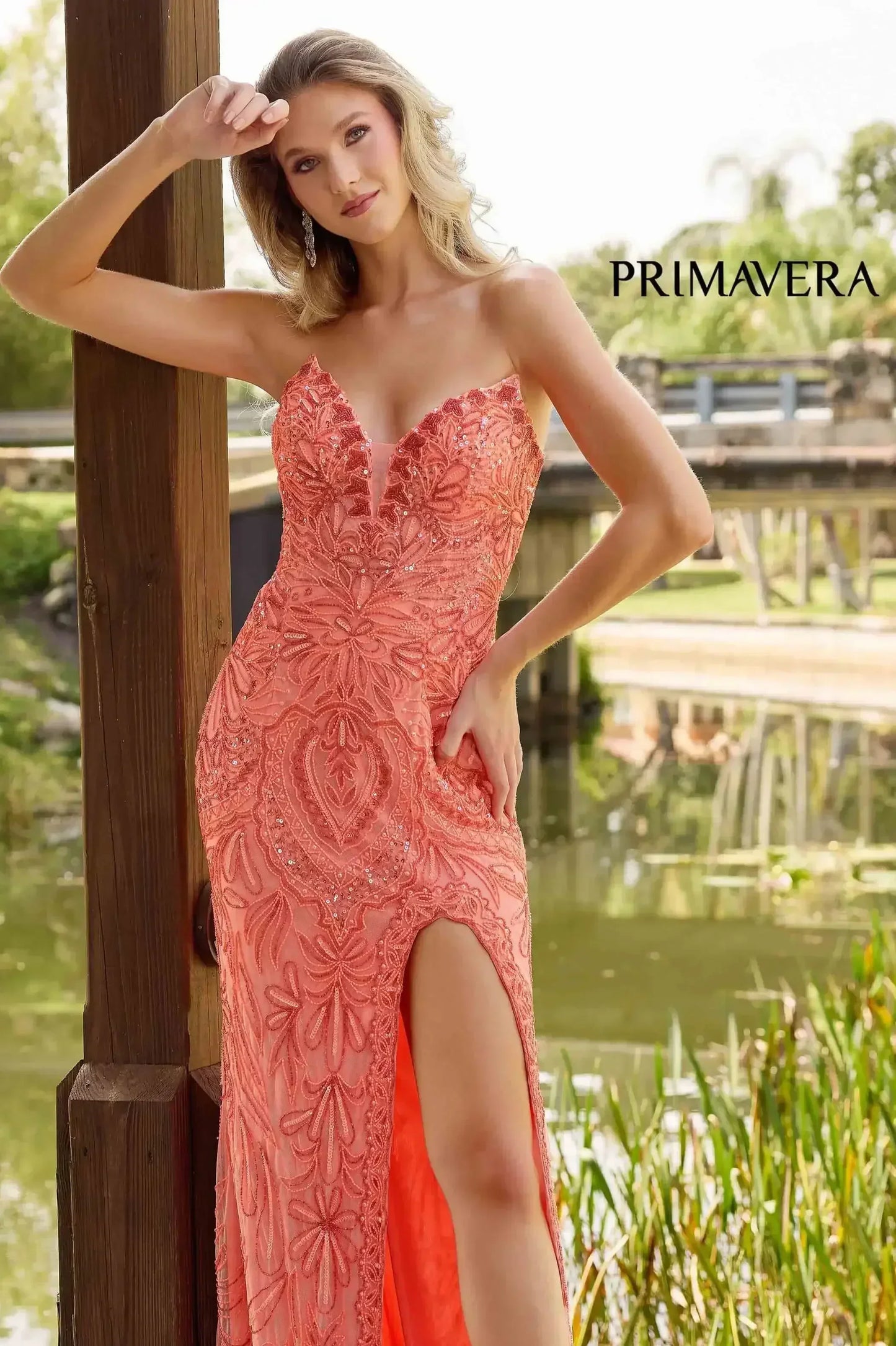 Command attention in the Primavera 4335, a breathtaking strapless fitted gown designed to dazzle. Featuring a flattering V-neckline, this gown is adorned with intricate hand-sewn beads and sequins that shimmer from every angle. The figure-hugging silhouette accentuates your curves, while a daring thigh-high slit and elegant train add movement and glamour. Perfect for prom, pageants, galas, and formal events, this gown delivers timeless sophistication with a bold, modern edge.