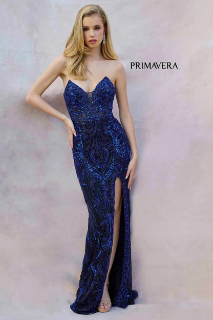 Embody elegance and confidence in the enchanting Primavera style 4343. This eye-catching fitted gown boasts a bold strapless V-neckline with striking points and a corset lace-up back for a flawless fit. The sleek skirt features a daring thigh-high slit and graceful sweep train, adding a touch of allure. Fully adorned with vibrant, dazzling beadwork, this dress is bound to captivate and make a lasting impression.