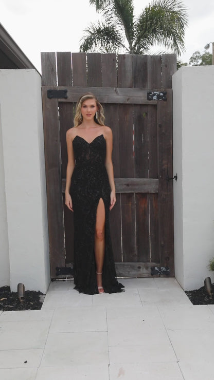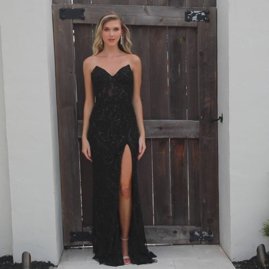 Captivate the crowd in the stunning Primavera style 4356. This fitted gown showcases a strapless pointed V-neckline, perfectly complemented by a corset lace-up back for a sculpted fit. Adorned with shimmering beadwork and sequins in an elegant swirled floral pattern, this dress dazzles from every angle. A daring thigh-high slit and graceful sweep train complete the look, ensuring all eyes are on you.