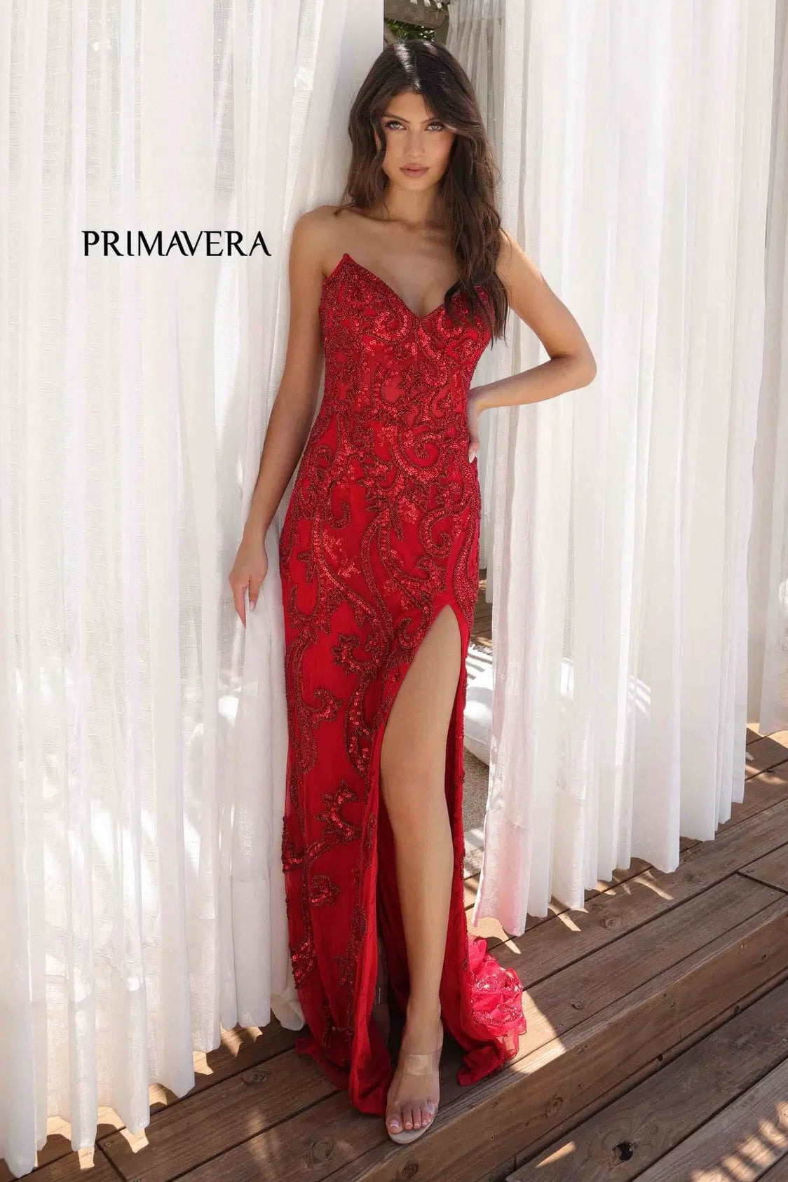 Captivate the crowd in the stunning Primavera style 4356. This fitted gown showcases a strapless pointed V-neckline, perfectly complemented by a corset lace-up back for a sculpted fit. Adorned with shimmering beadwork and sequins in an elegant swirled floral pattern, this dress dazzles from every angle. A daring thigh-high slit and graceful sweep train complete the look, ensuring all eyes are on you.
