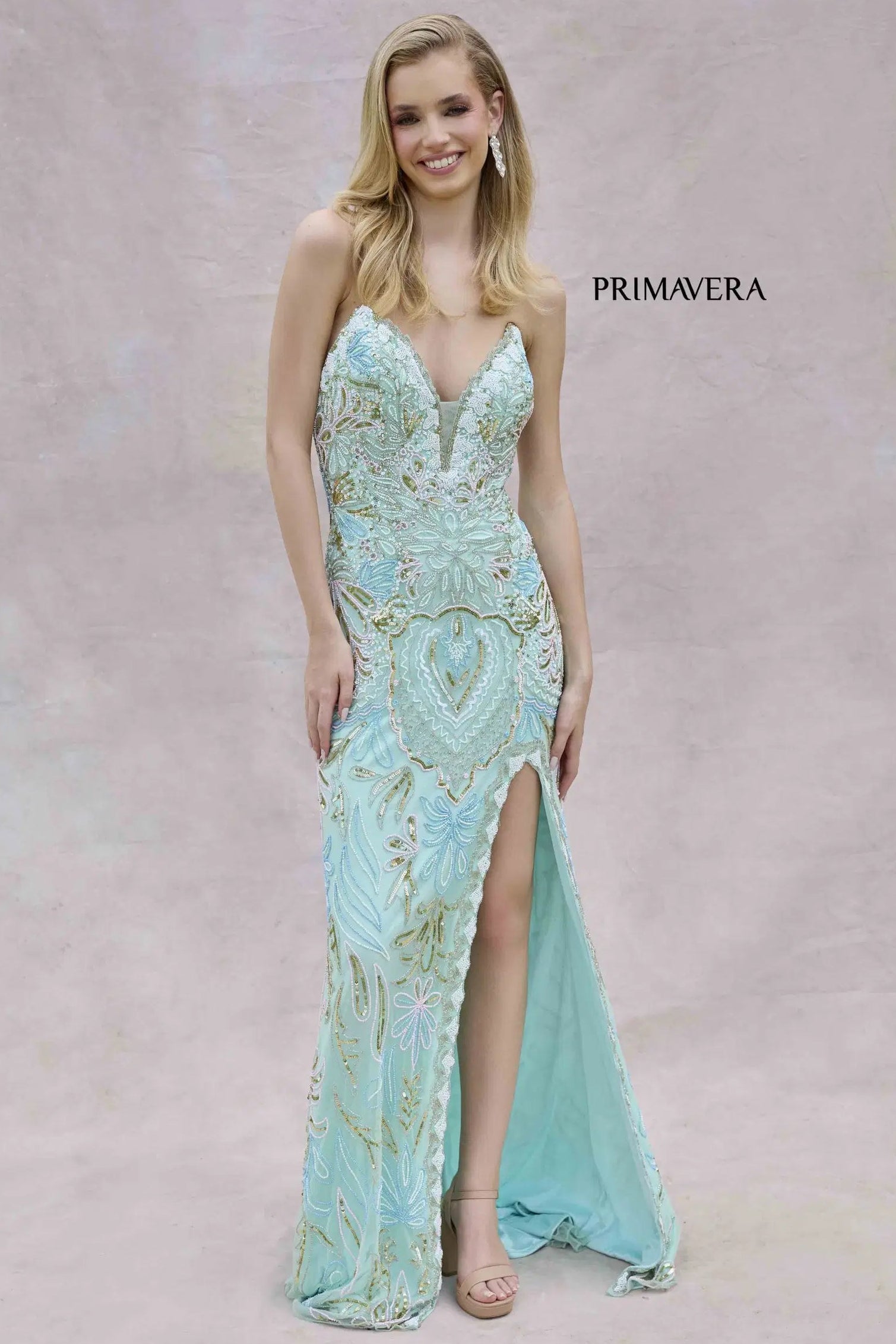 Sparkle and shine in the playful yet sophisticated Primavera Couture Style 4382. This vintage-inspired long gown features vibrant sequins and intricate beadwork that create a bold, eye-catching finish. The pointed V-neckline adds a modern edge to the strapless design, while the sleek sheath silhouette elongates the figure with effortless elegance. Designed to make a statement, this gown is perfect for prom, formal events, and special occasions where confidence and standout style take center stage.