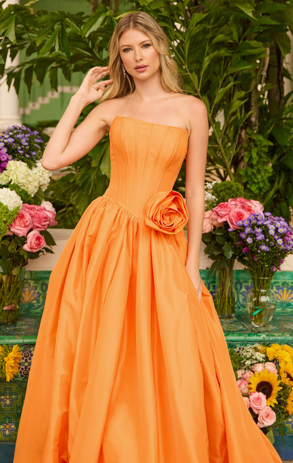 Make a statement in the Ava Presley 47204, a show-stopping ball gown that refuses to go unnoticed. The structured strapless bodice with corset seaming hugs you in all the right ways, while the full skirt commands attention. A dramatic side slit keeps things moving, and an oversized rosette detail? That's your showstopper moment.