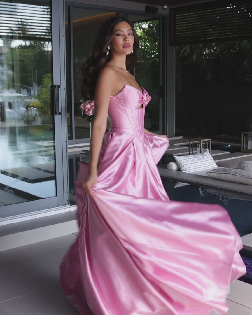 Add a regal touch to your event with the Ava Presley 47223 ball gown, a dreamy satin masterpiece. This strapless beauty features a structured bodice with a corset bodice, tasteful cutout and center floral detail, enhancing its modern princess aesthetic. Perfect for prom, pageants, or formal galas, the full pleated skirt creates a statement silhouette that commands attention.