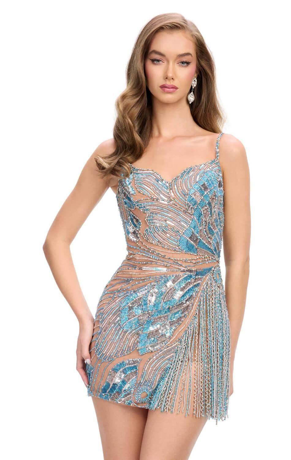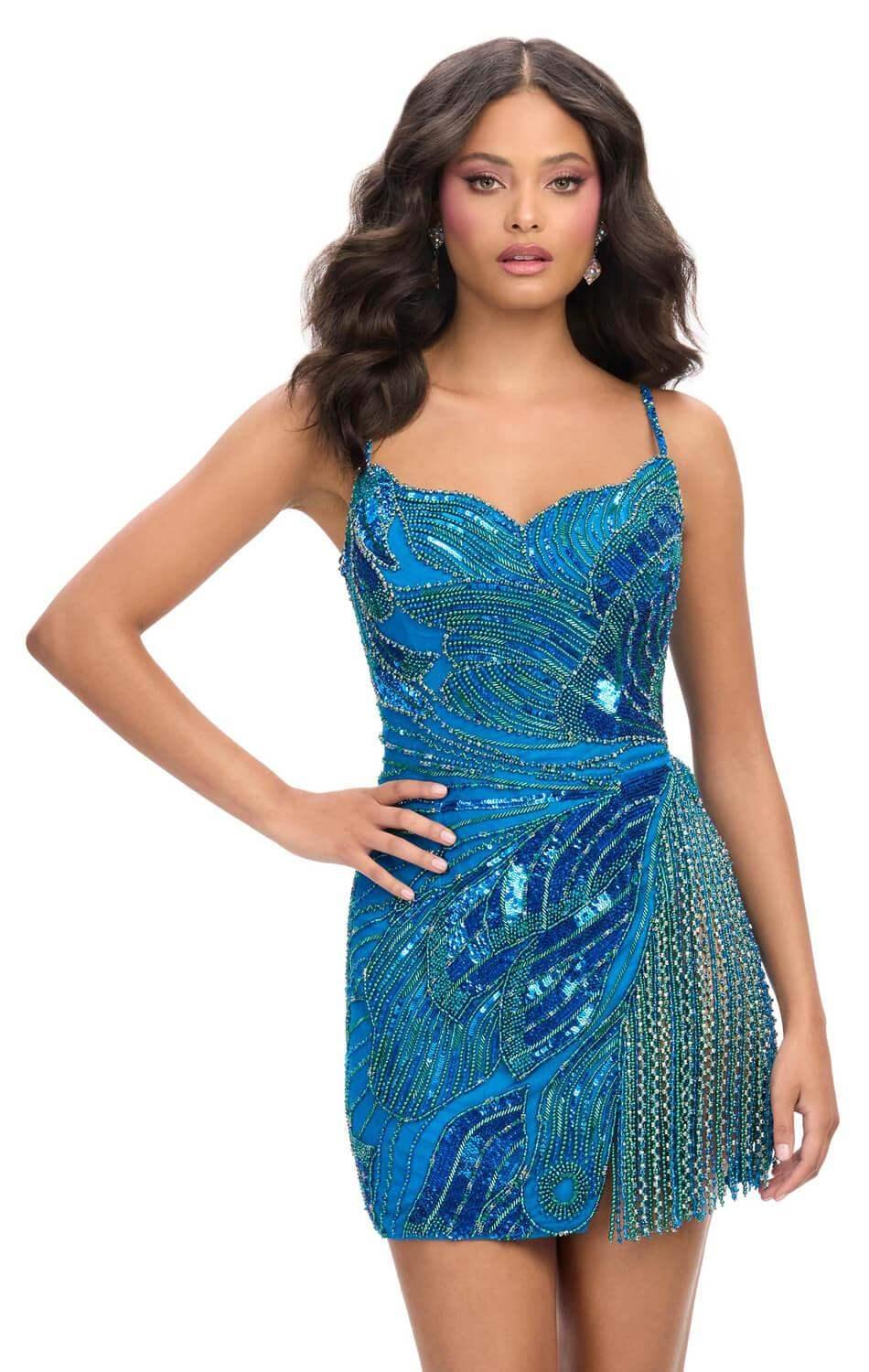 This cocktail dress is sure to capture everyone's attention. The beaded fringe detail along the illusion slit adds an elegant, captivating touch. Designed with delicate spaghetti straps, a graceful V-back, an illusion panel, and a stylish left leg slit, it combines sophistication with striking accents.