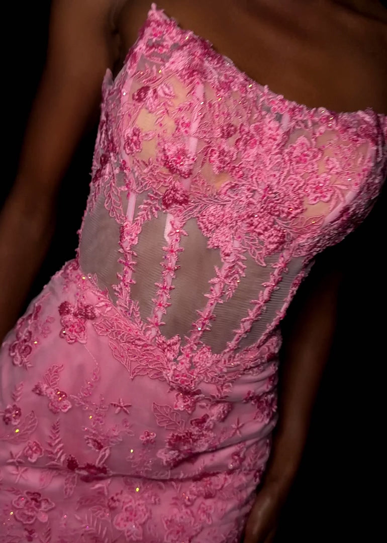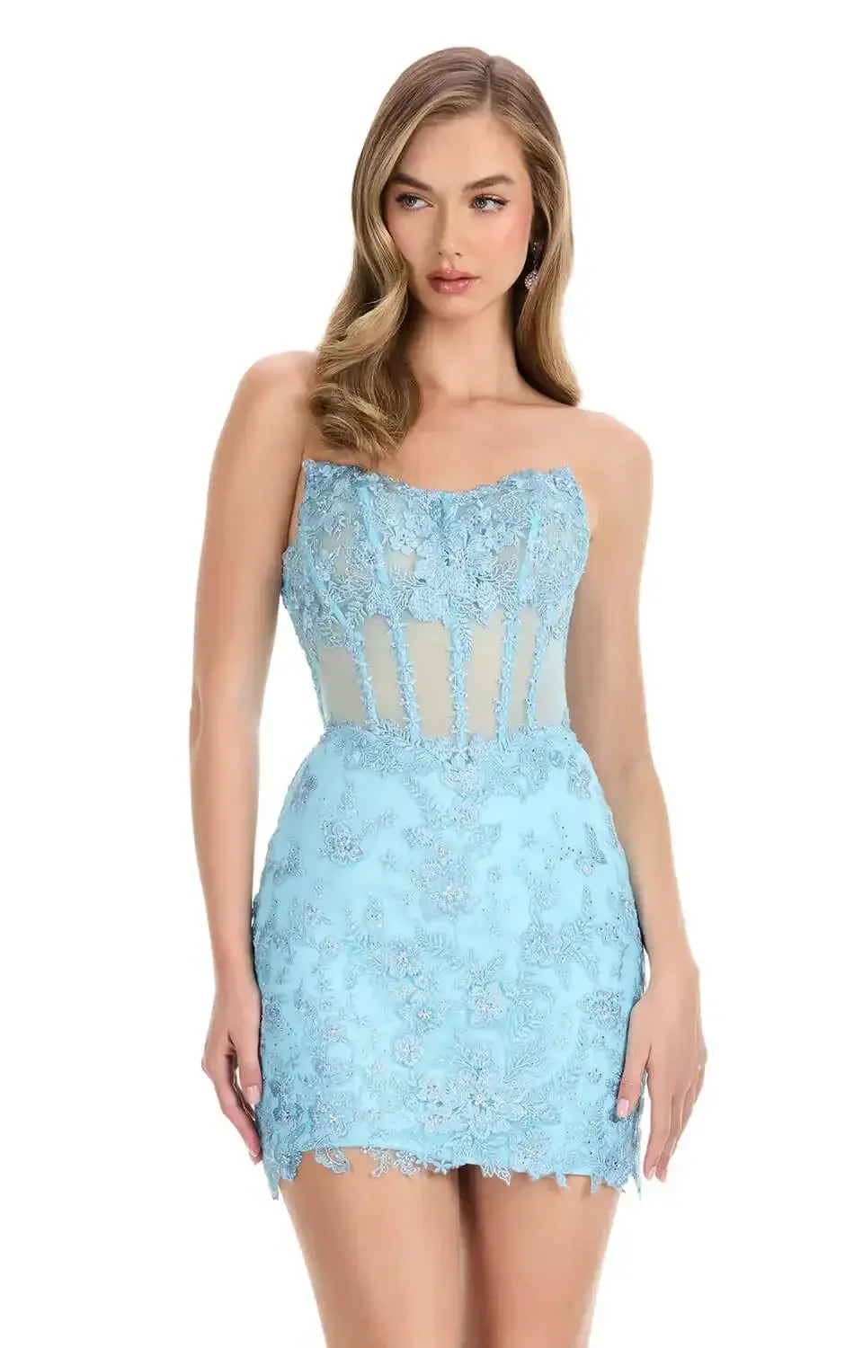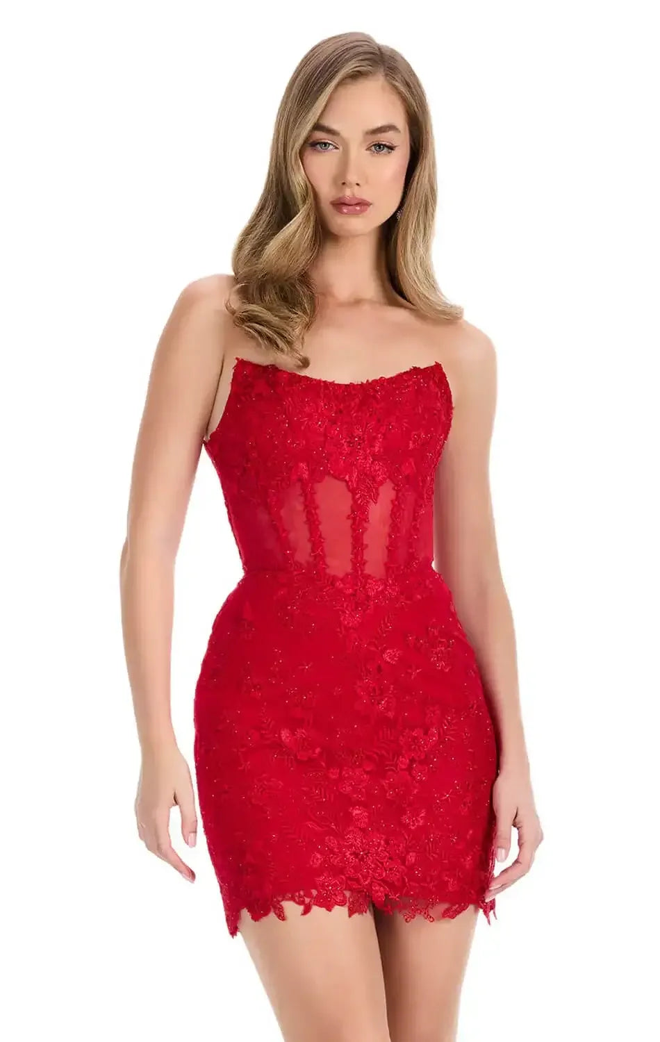 Elevate your look with the ASHLEYlauren Style 4852 strapless lace appliqué mini dress. Featuring a fitted silhouette with a semi-sheer bodice and intricate floral lace details, this dress blends sophistication with flirty charm, perfect for cocktail parties and special occasions.