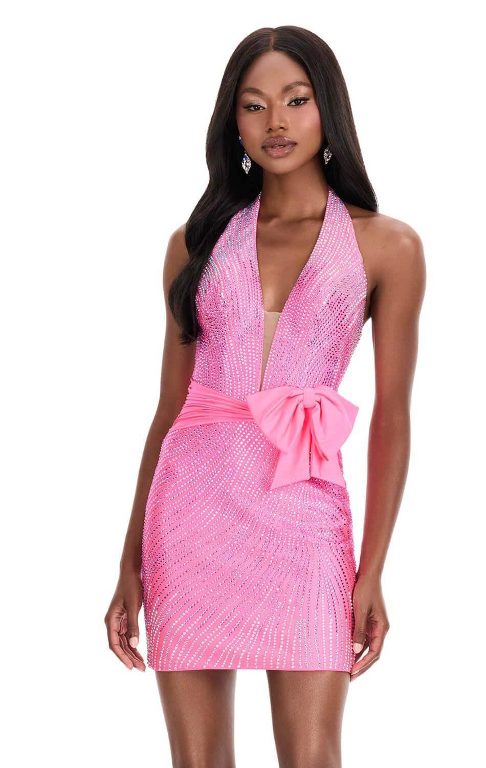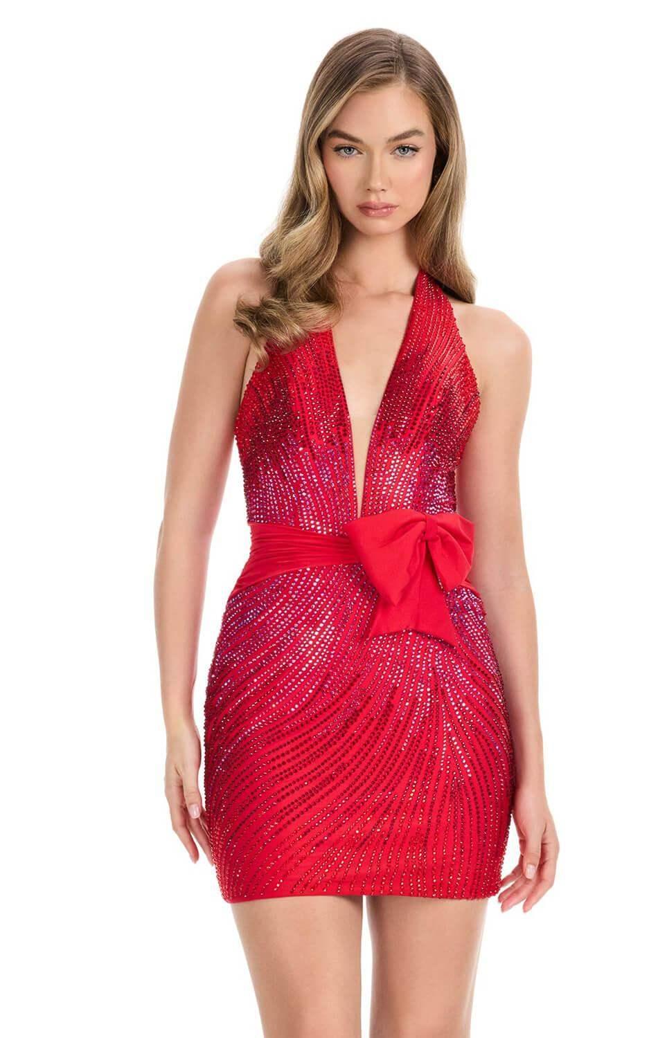 Turn heads in ASHLEYlauren Style 4854, a fully beaded jersey mini dress that dazzles with intricate press-on sequins and a deep V neckline. This bold, figure-hugging dress features a dramatic low back and a wide sash with a statement bow at the waist, perfect for cocktail parties, homecoming, or special events.