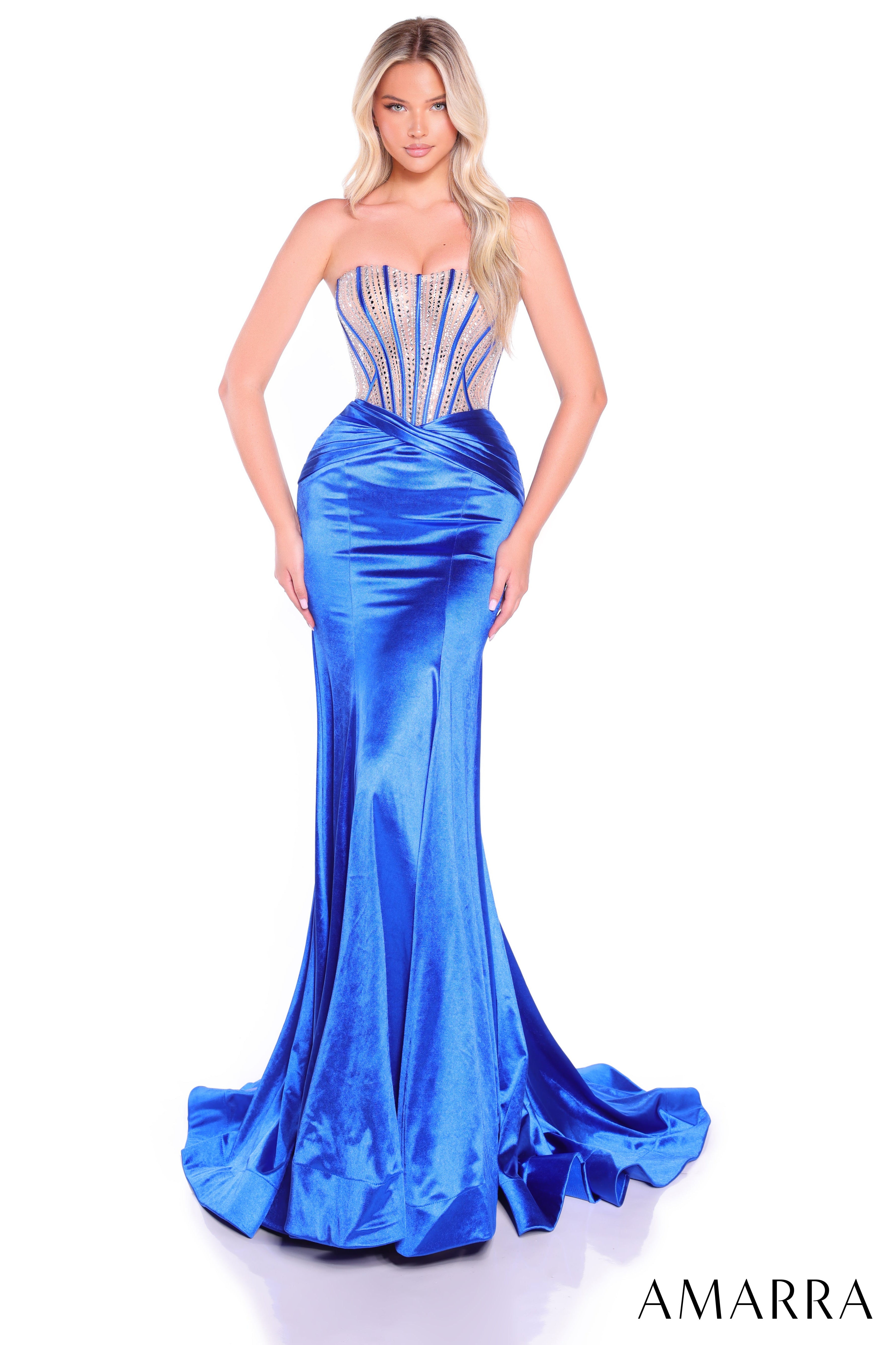 Turn heads the moment you arrive in the AMARRA 89070 gown, a stunning blend of sophistication and eye-catching sparkle. This fitted evening dress features a breathtaking crystal-embellished bodice that glimmers beautifully under the lights, creating a glam, red-carpet-ready look. The strapless straight neckline highlights the décolletage, while the sleek satin skirt flows effortlessly into a flattering fitted silhouette. The lace-up back finishes the gown with customizable structure and a perfect, sculpted fit.