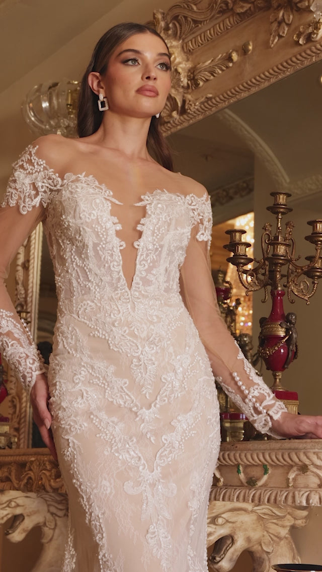 This stunning long-sleeve lace wedding gown features intricate lace detailing throughout the bodice, blending timeless elegance with modern allure. Classic from the front and captivating from the back, it boasts a heart-shaped open-back design for a touch of romance. The delicate lace sleeves gracefully extend to the knuckles, perfect for showcasing the wedding ring in close-up shots. Finished with a luxurious scalloped lace hem that extends into a breathtaking mermaid silhouette, this gown is designed to make every bride feel truly beautiful.