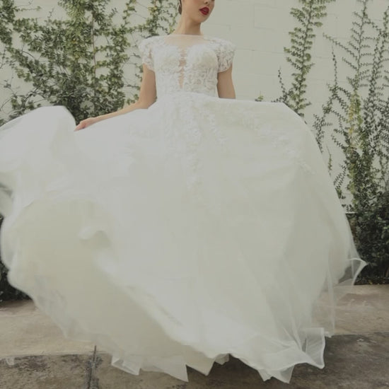 Classic and elegant, the Catherine Gown radiates royal wedding sophistication. A deep plunging tulle neckline contours the bustline to the waist, creating a flattering silhouette. This timeless ball gown is adorned with delicate Chantilly lace appliqués along the bodice and skirt. The cap sleeves gracefully drape over the shoulders, while the lace-up corset back adds a touch of vintage charm, pulling the entire look together.
