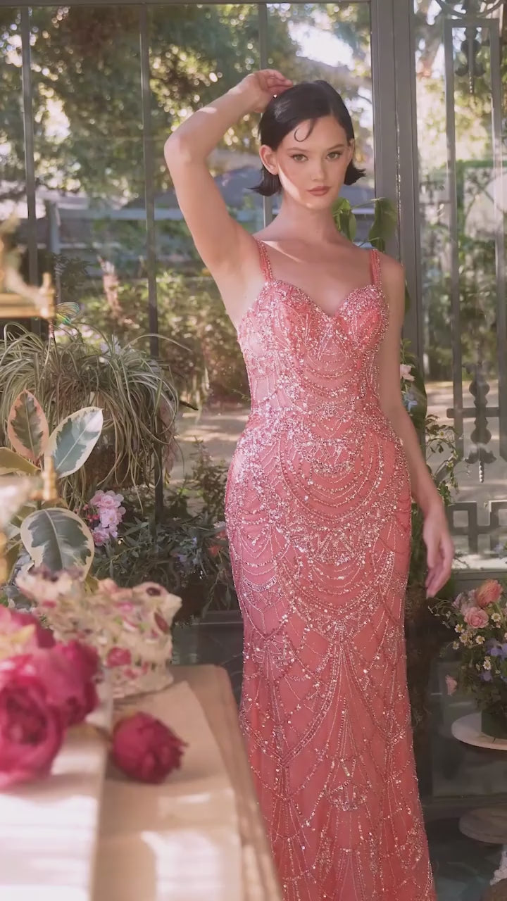 Make a lasting impression in the A1363 – Fitted Beaded Evening Gown by Andrea & Leo, a vintage-inspired masterpiece that radiates glamour and grace. This stunning design features a sweetheart neckline and delicate straps, paired with an intricate all-over beaded motif that sparkles with every step.