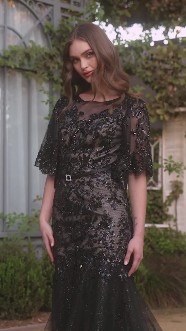 The gown is intricately detailed with a sequin floral motif over beaded tulle, layered on a soft nude lining for a graceful, dimensional finish. Whether you're attending a black-tie gala, formal wedding, or stepping into the spotlight as mother of the bride, this gown delivers timeless sophistication with a hint of ethereal charm.