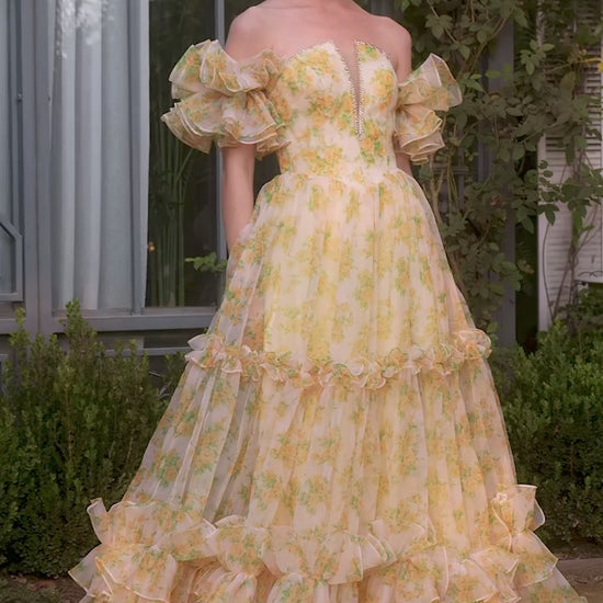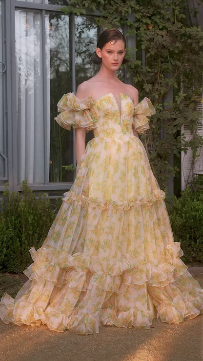 Turn heads in this enchanting yellow floral printed organza ball gown, perfect for prom or formal occasions. Featuring a strapless deep V-neckline and an intricately embellished edged bodice, this gown offers a structured fit for flawless support. Removable puff sleeves and a dramatic layered ruffle skirt complete the look, combining whimsical elegance with bold sophistication.