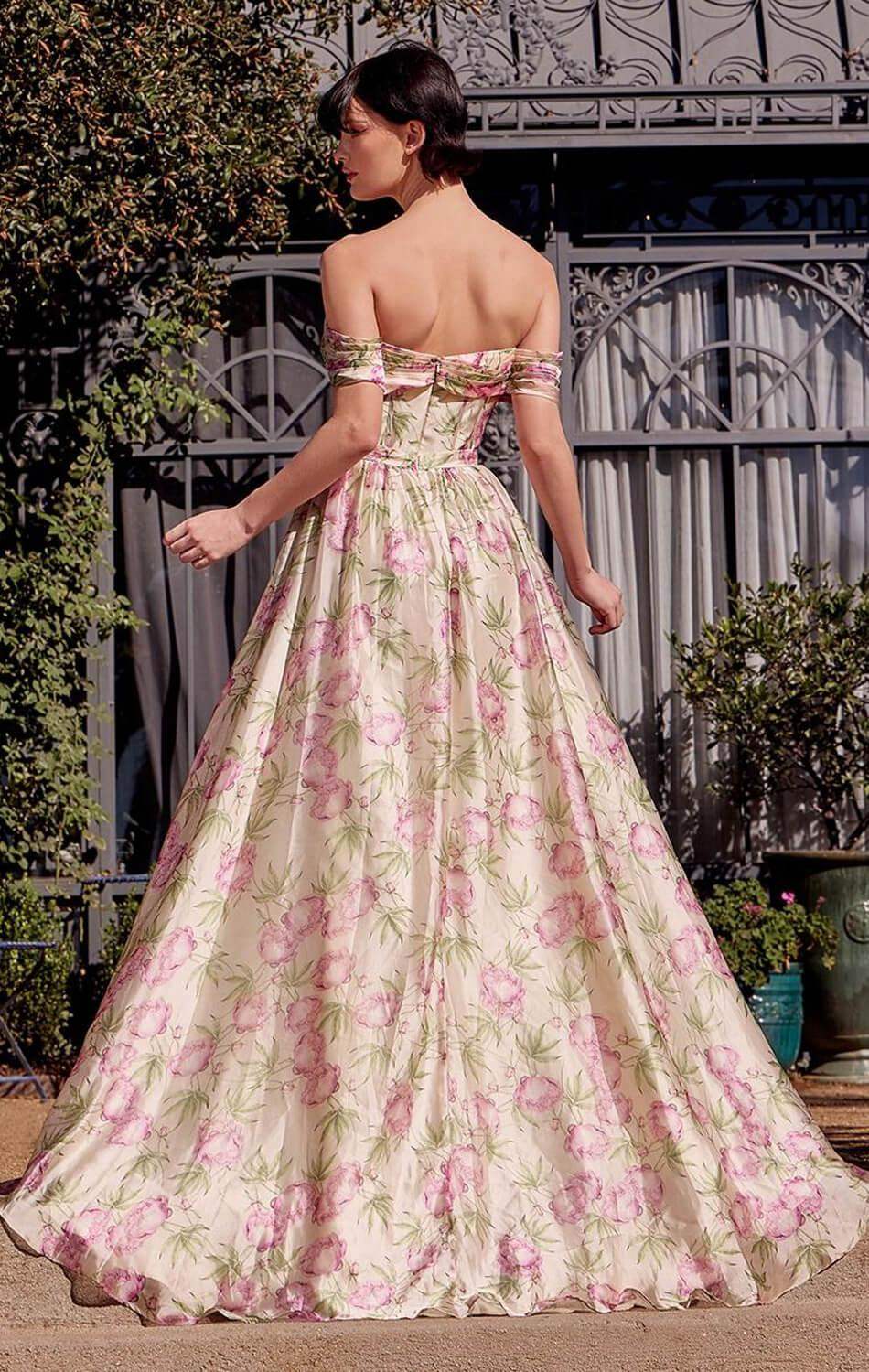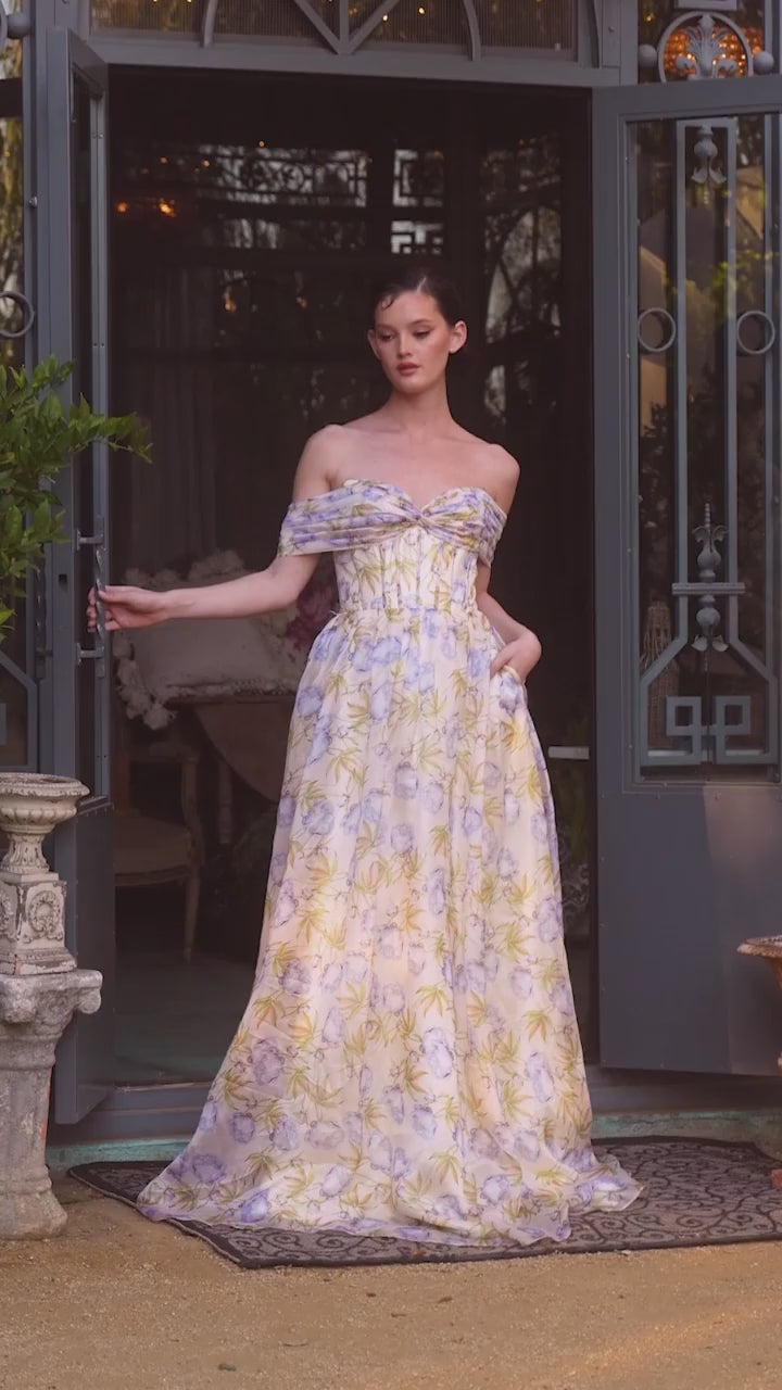 Make an unforgettable entrance in this romantic off-the-shoulder A-line gown, designed to exude timeless elegance. The sweetheart neckline and pleated bodice offer a touch of classic charm, while the soft floral organza fabric adds a dreamy, ethereal finish. A structured bodice with lace up back ensures a flattering, supportive fit, making this dress as comfortable as it is enchanting. Perfect for prom, formal events, garden parties, or any occasion that calls for graceful sophistication.