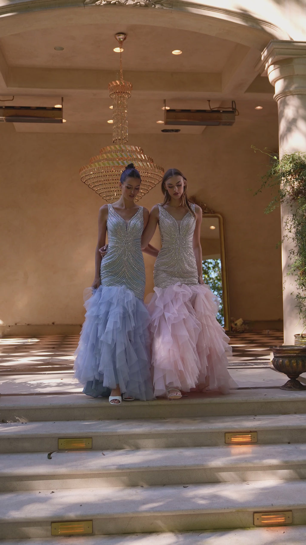 The Andrea & Leo A1493 mermaid gown is a breathtaking expression of contemporary elegance. Designed with a fully beaded illusion bodice, this gown features intricate chevron beadwork that sculpts the figure from every angle. A flattering V-neckline and low open back add modern allure, while the cascading, ruffle-tiered tulle skirt creates soft movement and dramatic volume. Finished with layers of glittering tulle, this showstopping design is perfect for red-carpet events, formal galas, and prom night, delivering both structure and ethereal beauty.