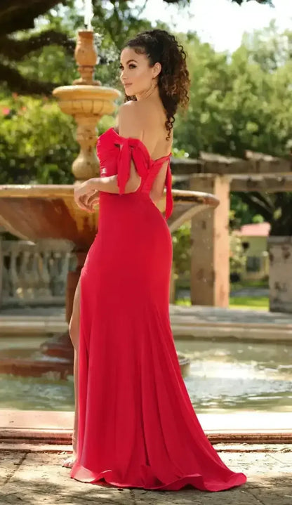 Cut from a luxe stretch jersey, the Amber Gown in RED is artfully tucked and ruched to accentuate your curves and features an alluring off-the-shoulder neckline framed by elongated ties and a floor- pooling fishtail hem defined by a dramatic front slit so you can show off your silhouette