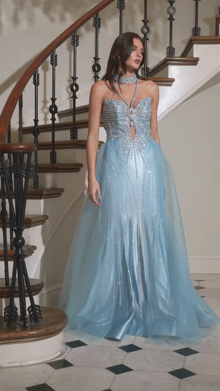 Designed to captivate, the Angelika gown features a sparkling halter-inspired neckline and radiant crystal beadwork that catches the light from every angle. The intricate linear embellishments sculpt the bodice and flow down the silhouette, creating a show-stopping, high-glamour effect. A dramatic jewel centerpiece highlights the front cutout, while the sleek satin skirt enhances every curve. Complete with a detachable tulle overskirt, this gown offers two unforgettable looks in one, perfect for pageants, prom, or any luxury affair.
