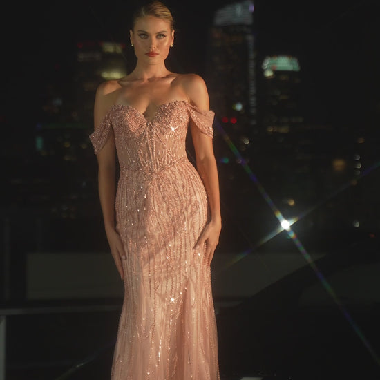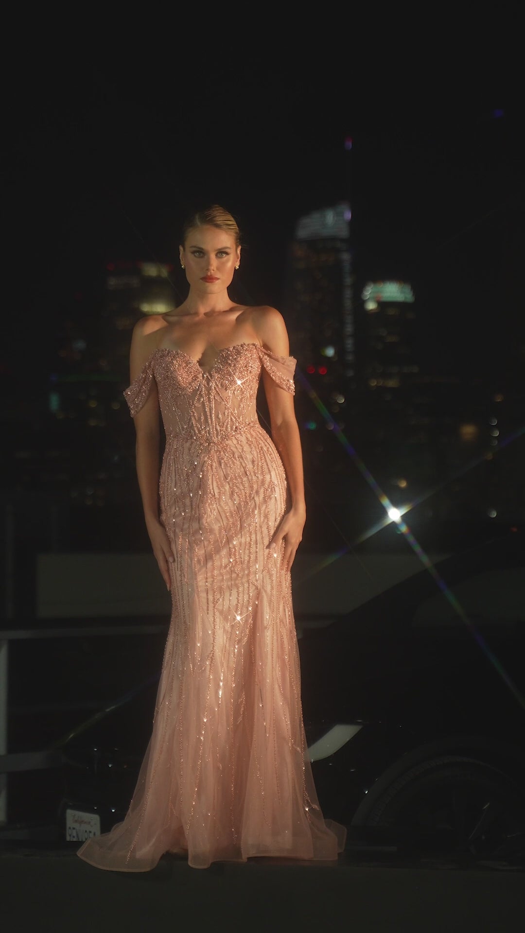 This fitted gown exudes elegance and charm, featuring a sweetheart off-the-shoulder neckline and a sheer bodice beautifully adorned with an intricate floral beaded motif. The sequin and bead-encrusted tulle overlay adds a subtle shimmer, ensuring you dazzle from every angle. The structured bodice offers enhanced support, while the lace-up corset back allows for a perfect, customizable fit.