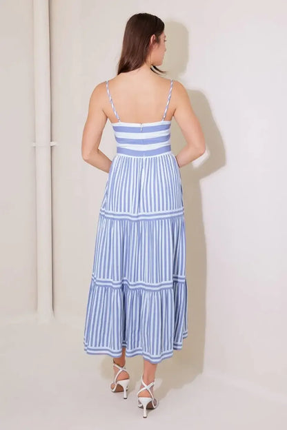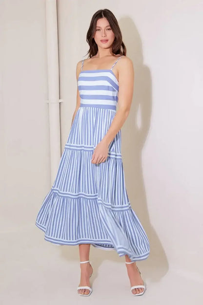 This effortless dress is perfect for any occasion, with its versatile design that can be dressed up or down. The tiered skirt creates movement, while the back zipper closure ensures a comfortable fit. It's a classic piece for any wardrobe.