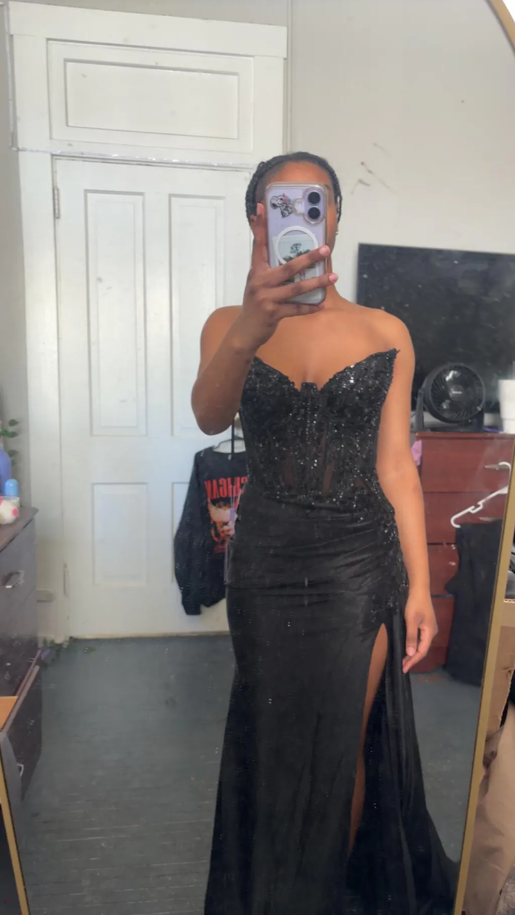 This fitted gown effortlessly combines sophistication and allure, making it a standout choice for any special occasion. The strapless sheer lace bodice is adorned with intricate embellishments, exuding elegance and glamour. A structured corset with lace-up detailing ensures impeccable support and a flattering fit. The taffeta skirt flows gracefully, featuring a striking leg slit that adds a touch of drama and modern flair. Perfect for prom, formal occasions, or black-tie events, this dress offers a stunning blend of contemporary elegance and timeless charm.