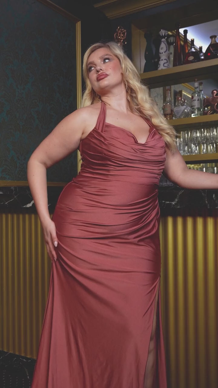 The Autumn Gown is a fresh, sophisticated take on formal dressing. Featuring a ruched halter neckline, gathered waist, and a chic leg slit, this column silhouette flatters with every step. Crafted from soft stretch spandex satin, it hugs the figure while offering comfortable movement. A zip-back closure ensures a secure fit, while full lining adds a smooth finish.